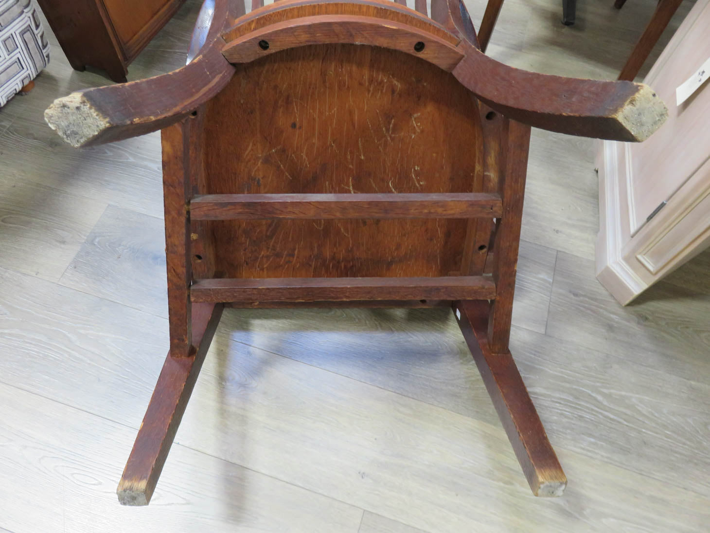Solid quarter-sawn oak with curved lumbar spindles, sculpted wooden seat and wide, curved arms