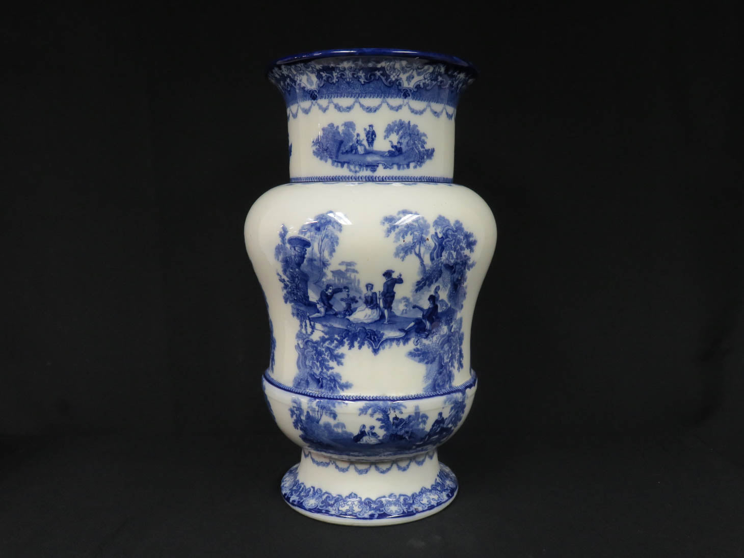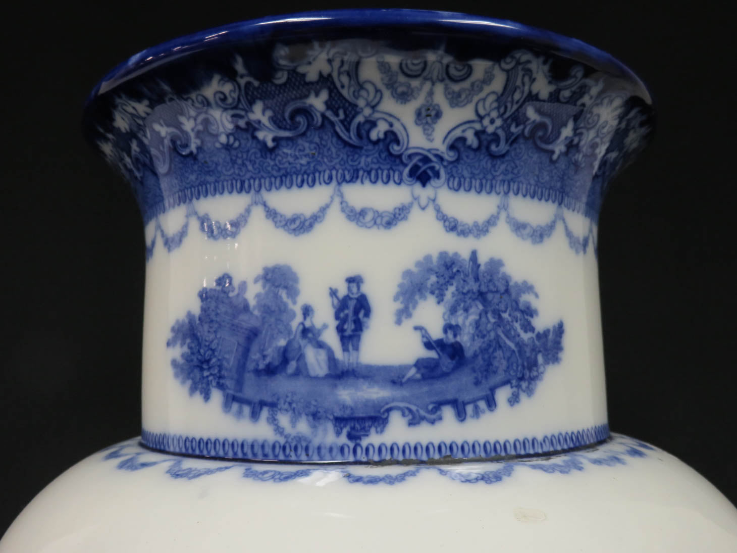 Item Number: 29877-5 "Wattteau", early 20th C., flow blue and white, classic courting scenes and floral swag and border 12" x 23"H