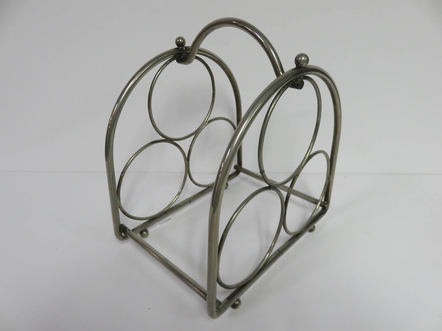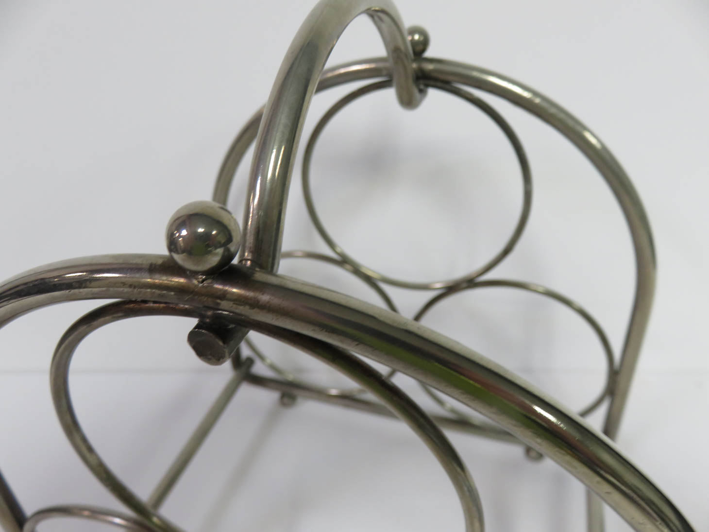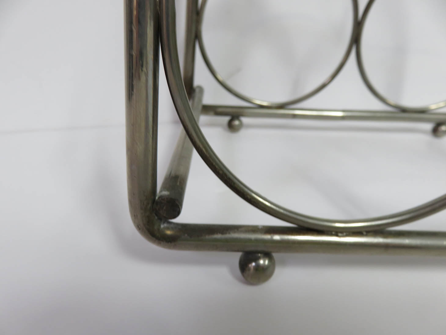 Silver toned, arched,footed, has curved handle, holds three bottles