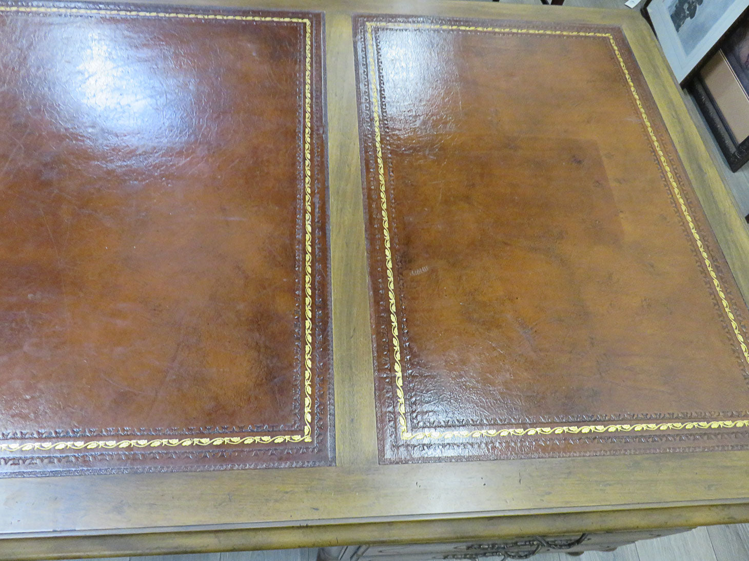 Six drawers, three tooled brown leather panels on top. 3 pull-out trays and hoof feet.
