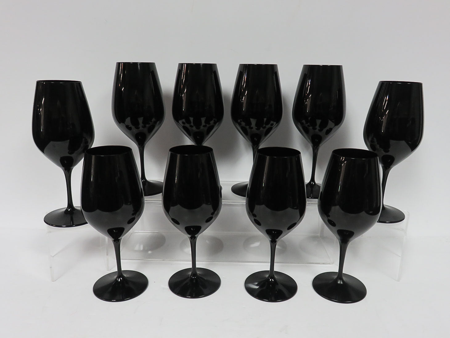 Set of 10, shiny black, stemmed, on round base. 7.5"