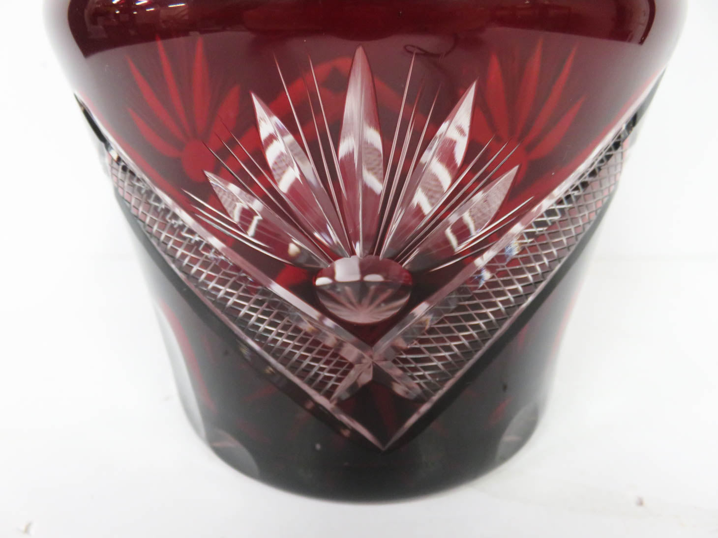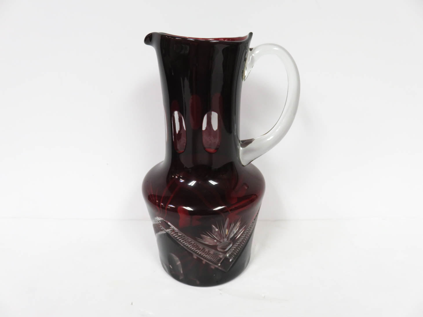 Pitcher with handle, 4 glasses, ruby red cut to clear, lotus leaf, starburst base (5 pcs) 10.5" H and 4.5" H
