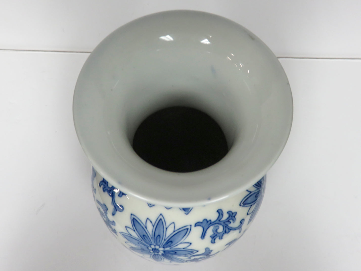 Blue and white scroll and floral design, flared neck