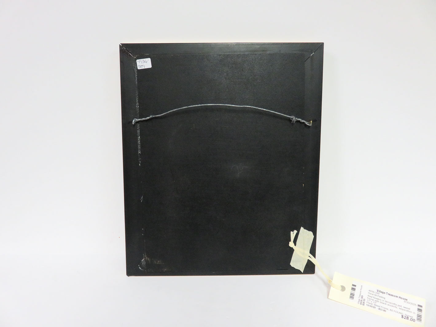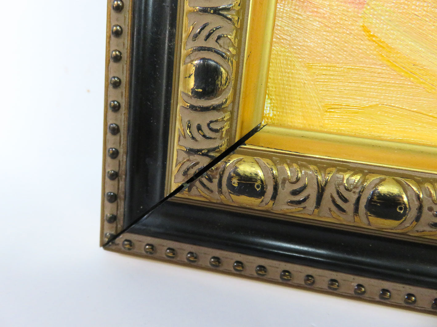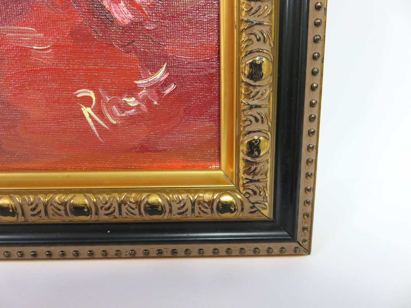 Red flowers in pot, signed by artist. Wood frame has separation in one corner of frame.
