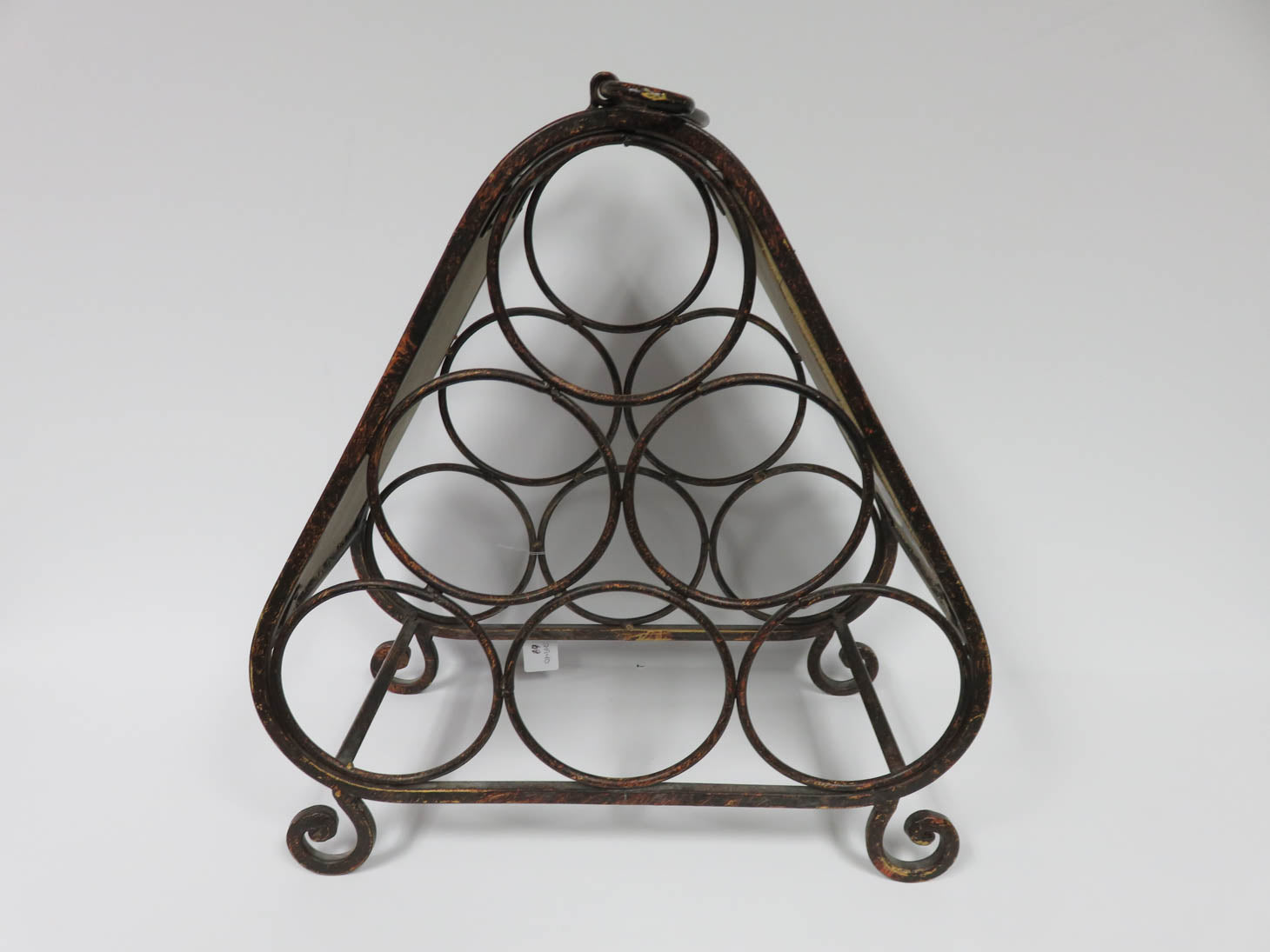 Item Number: 24940-69 Brown triangular metal with "Chateau de Bruges"; holds 6 bottles. 13" x 7" x 13.5"