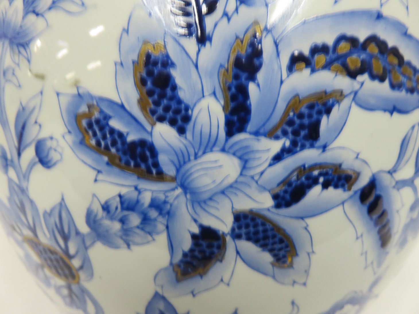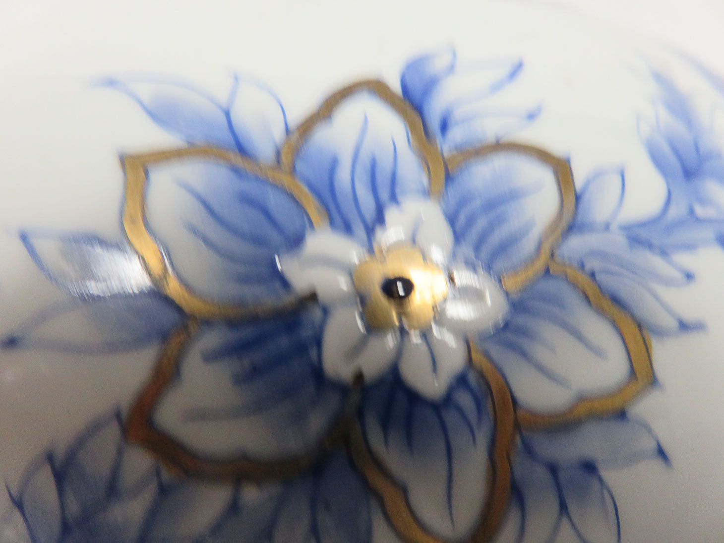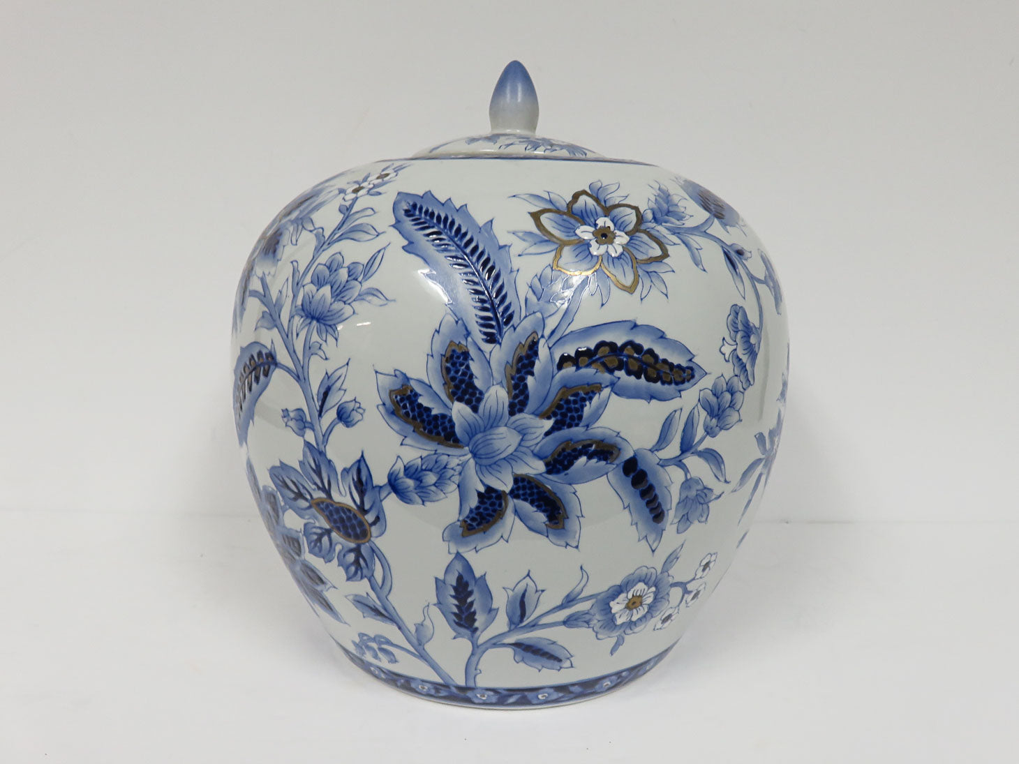 White with blue floral design, rounded shape with gold accents, with lid, 2 pc 8" x 10"