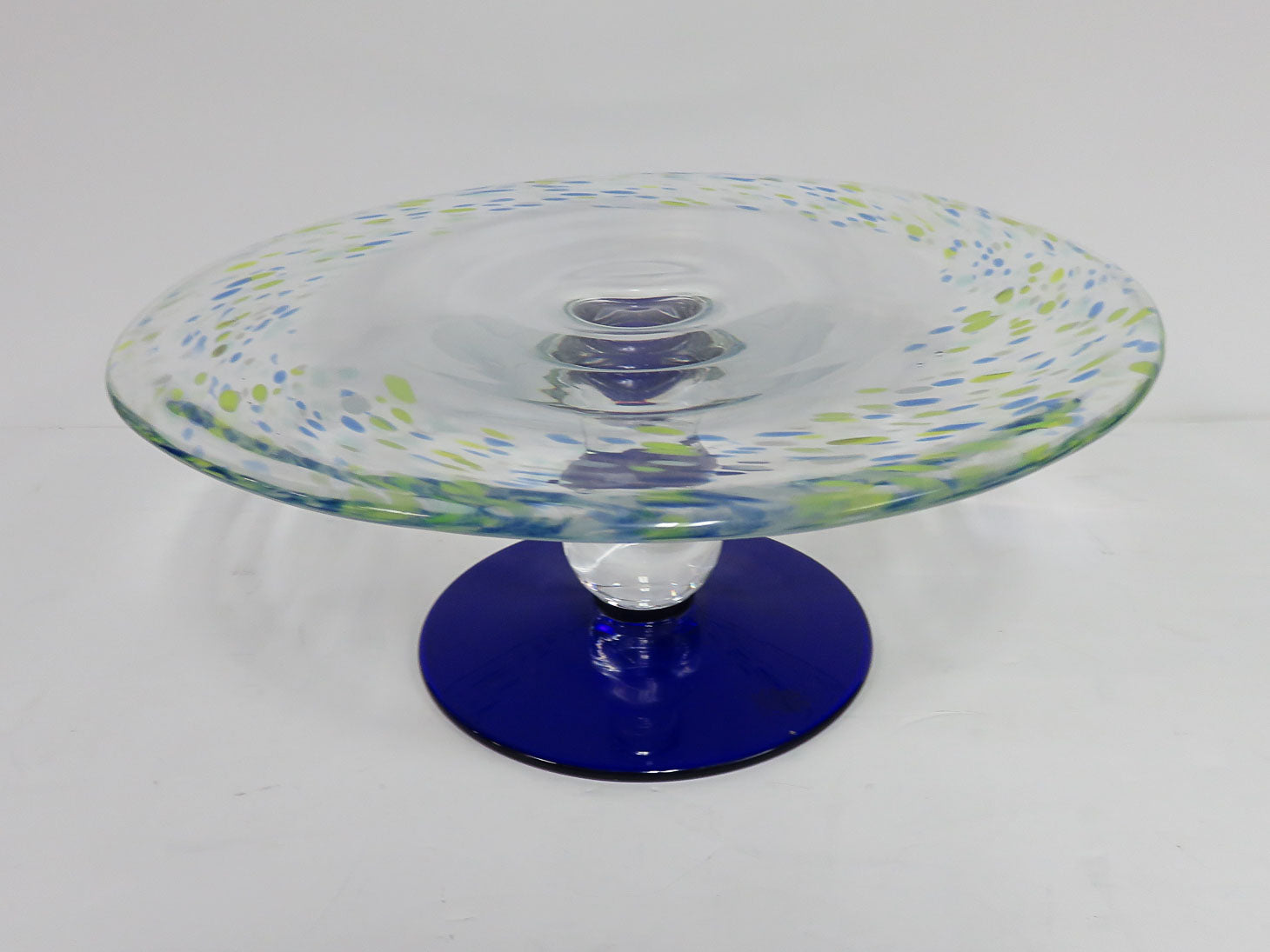 Round cobalt blue base, clear round top and green and blue confetti accents.