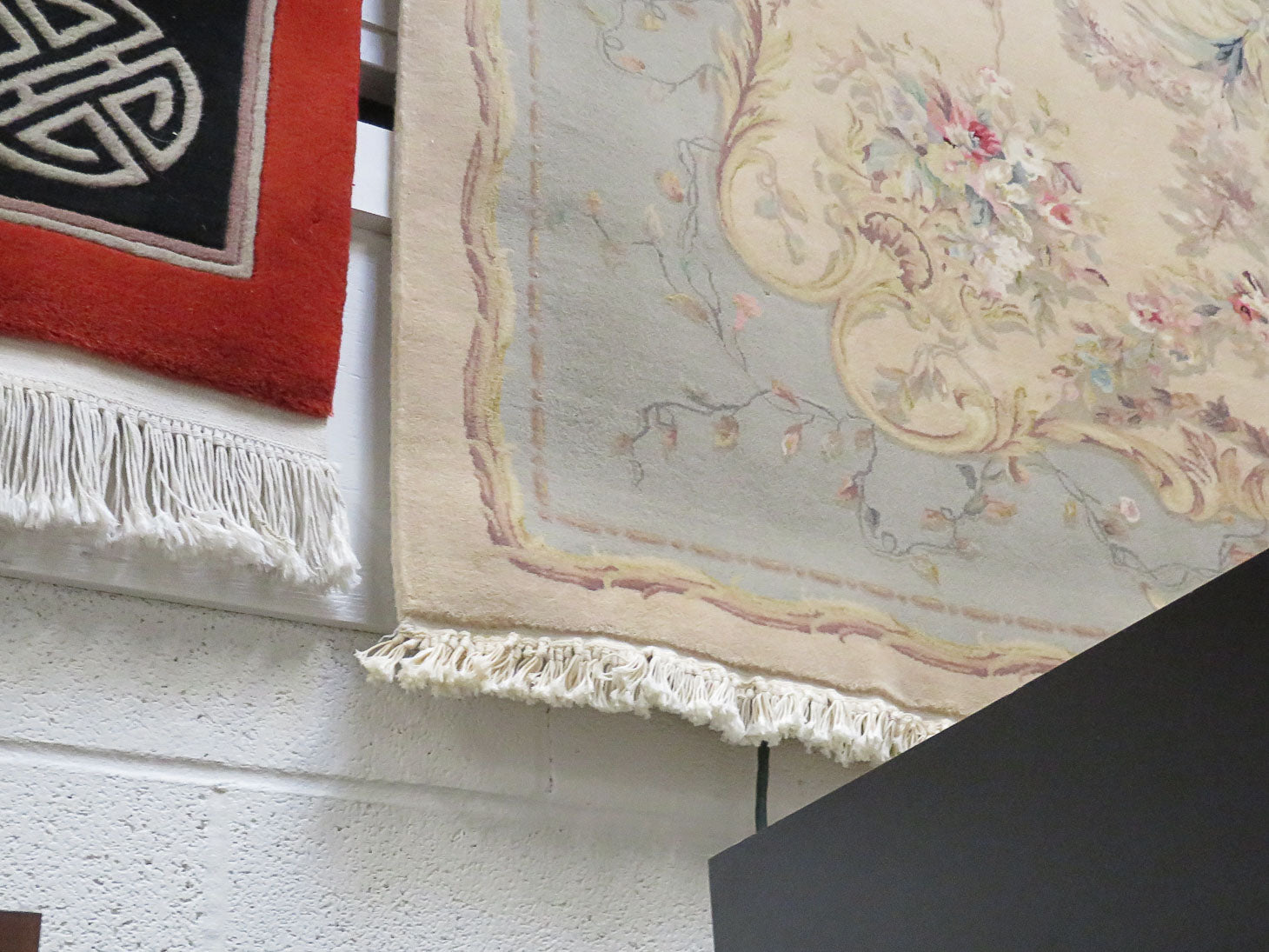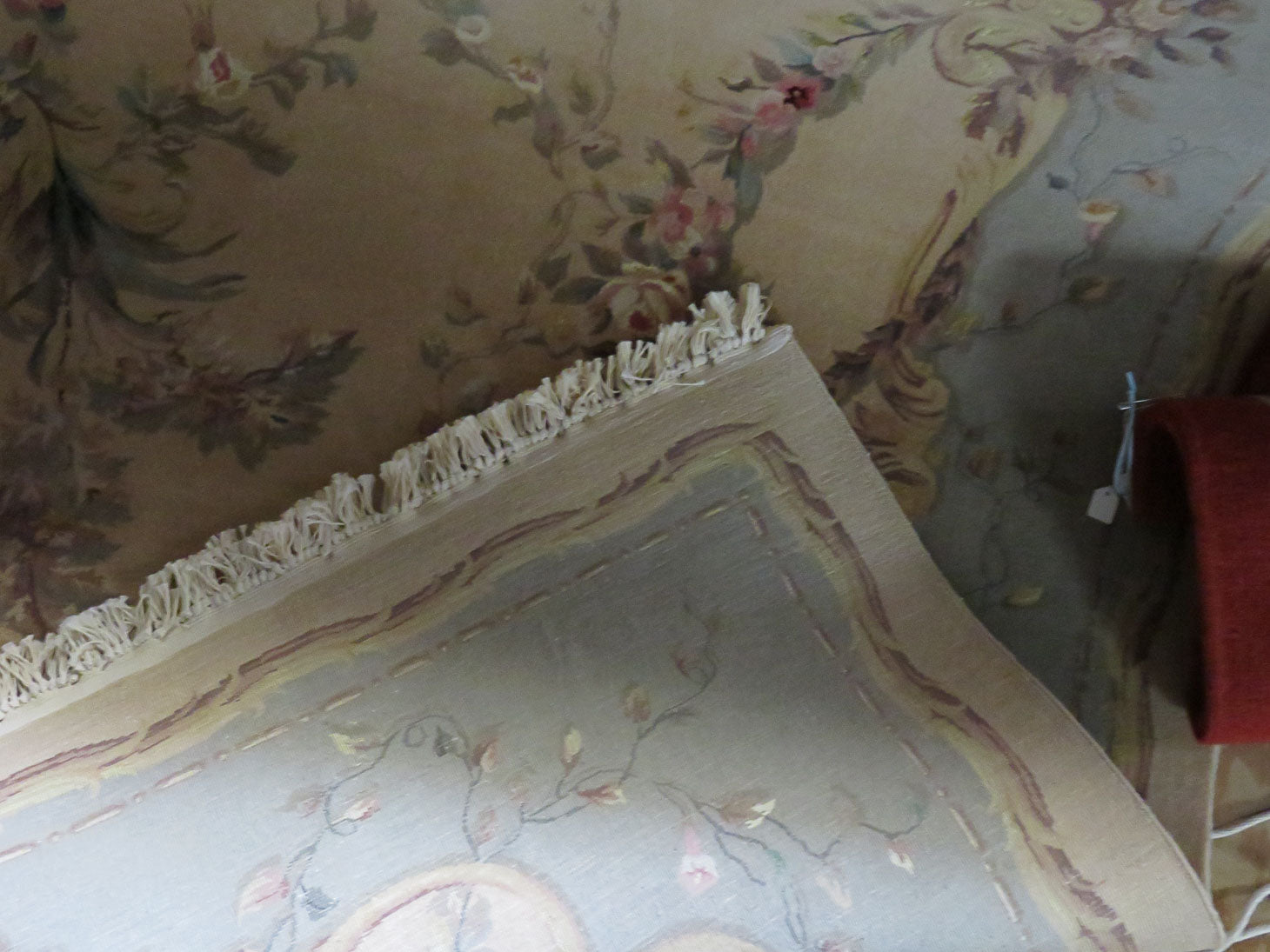 Beige, blue, pink & cream floral, with fringe 8' x 10'
