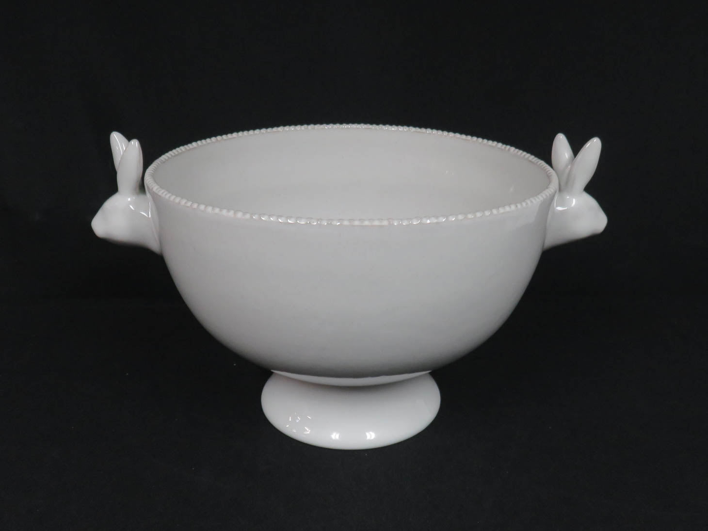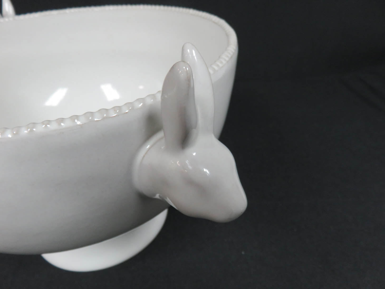 White stoneware bowl, pedestal base, two sculpted rabbit handles, beaded trim