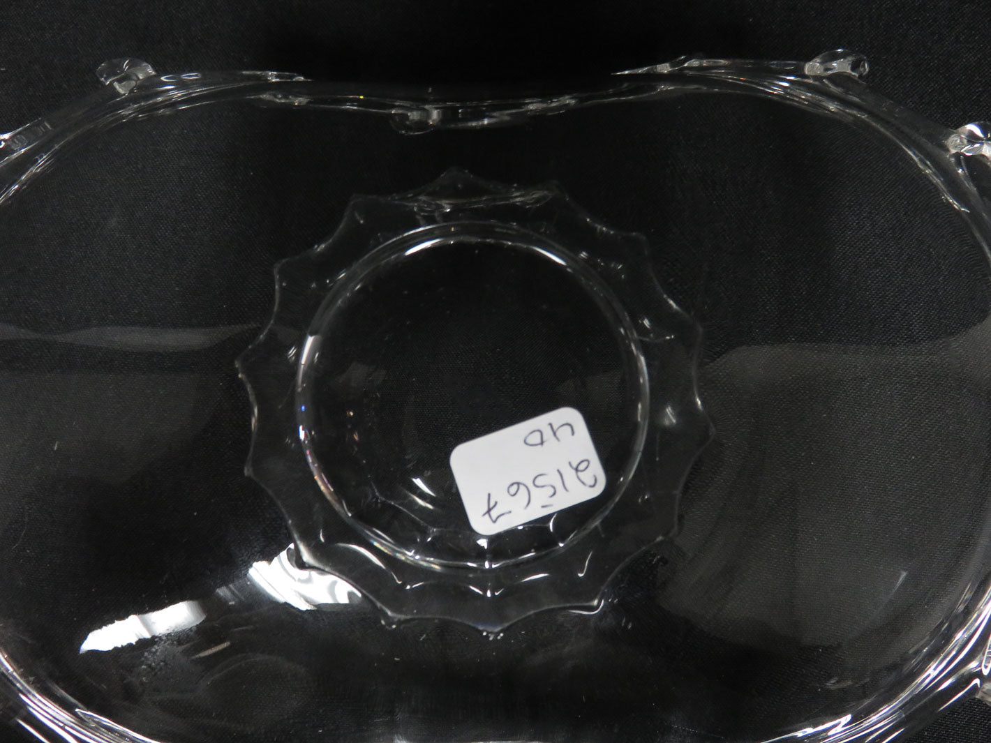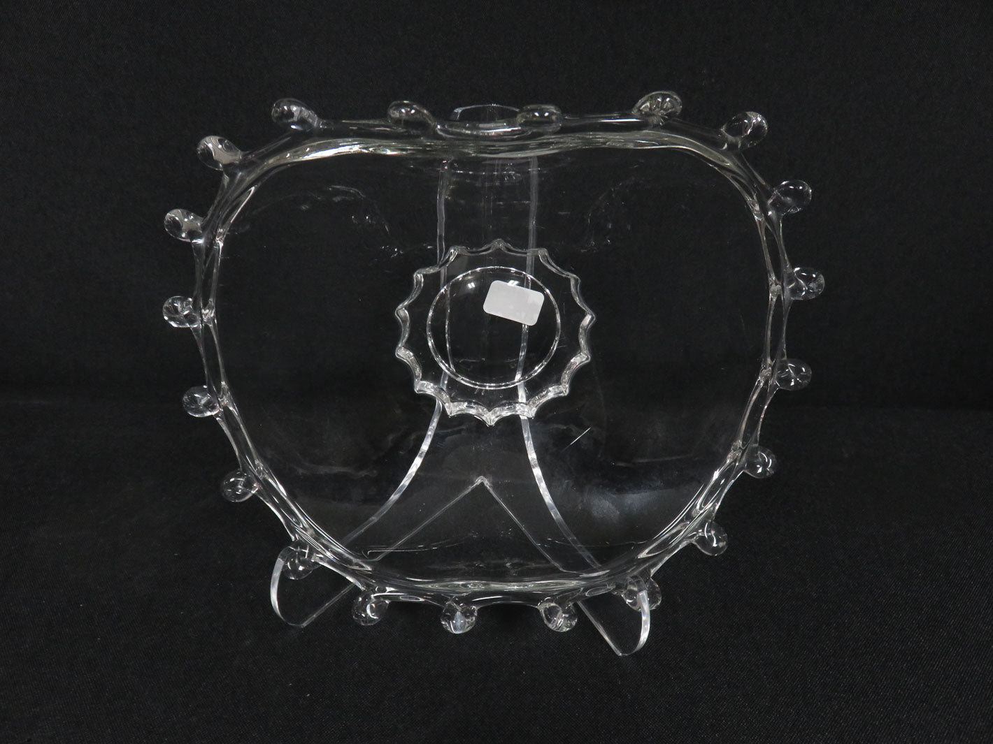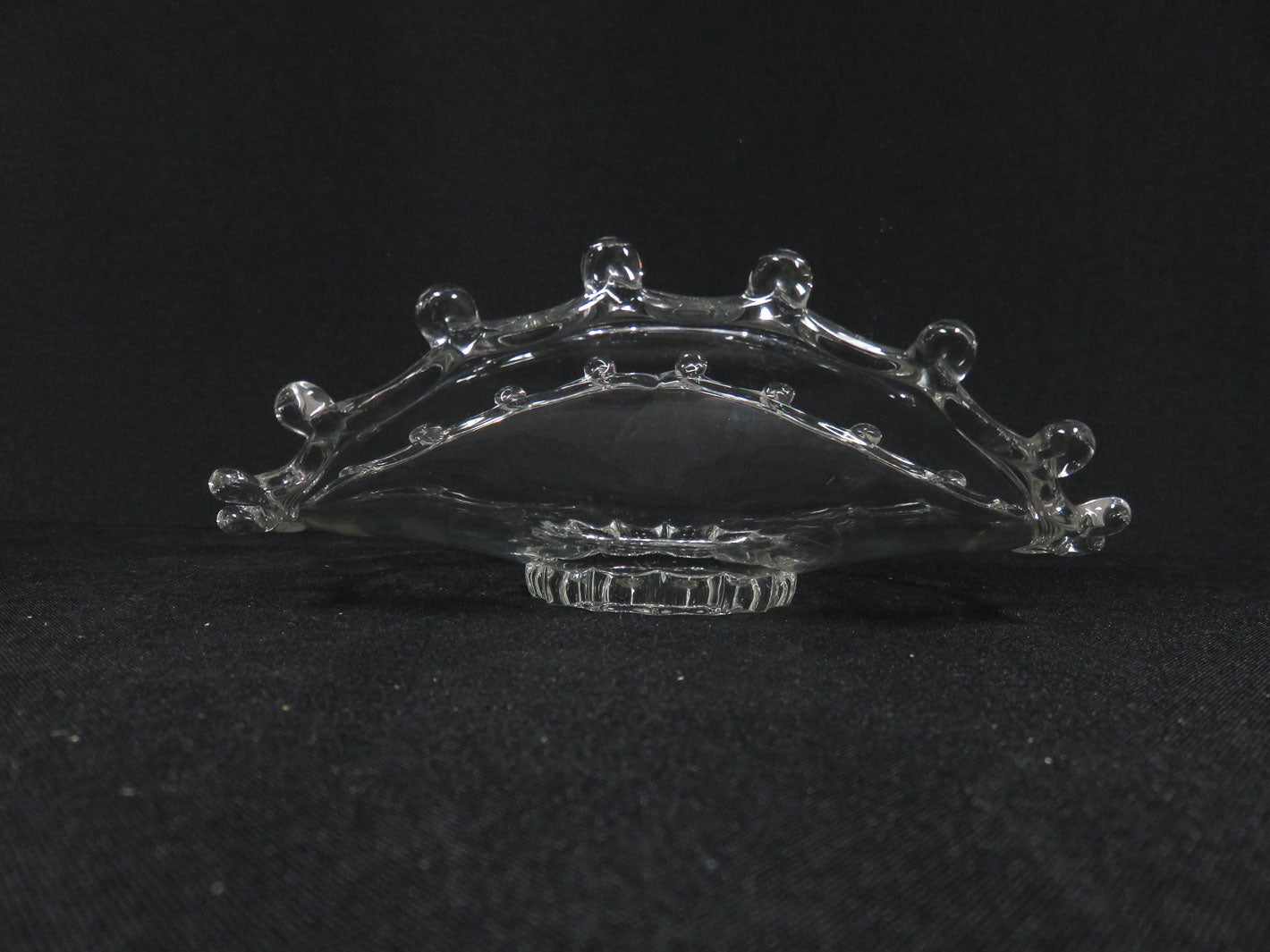 Item Number: 21567-40 "Lariat", folded, clear glass with looped edge, short round pedestal base. 5.5" x 8" x 2"