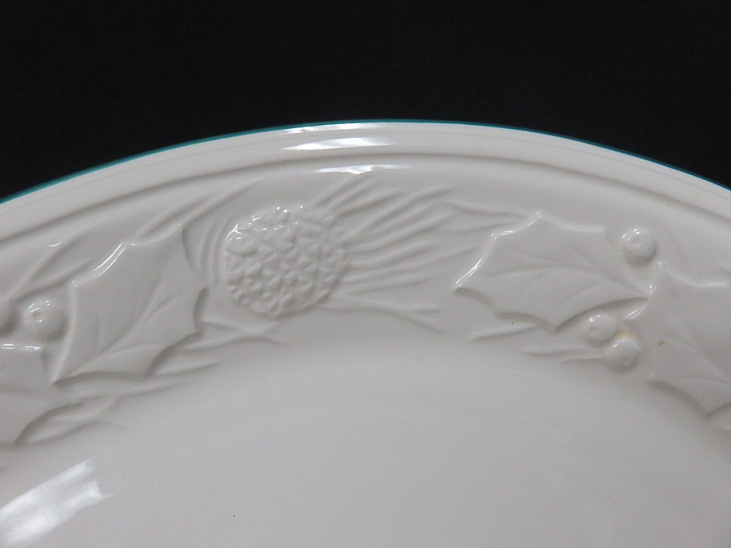 Item Number: 29275-32 White, oval, center green Christmas Tree with presents, raised white berry leaf design along rim 18.25" x 13.5"