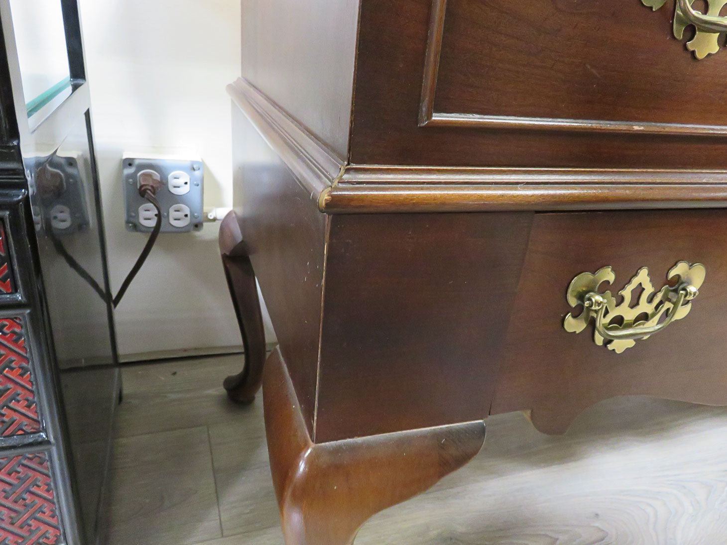 Queen Anne legs with single drawer. Has traditional brass hardware. Hinged lid with large cedar lined storage chest.