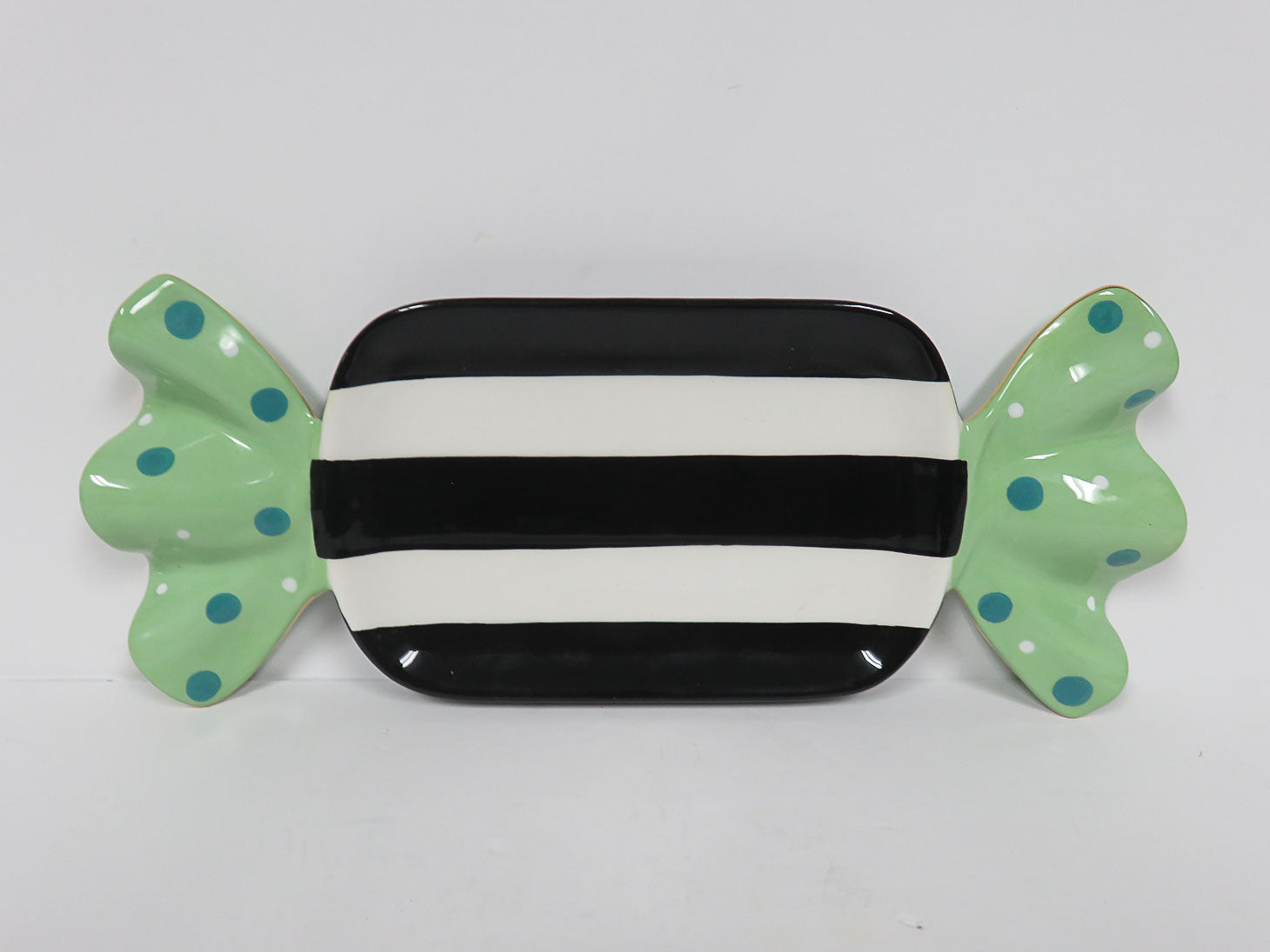 Black and white stripe with green ends, shape of a wrapped piece of candy