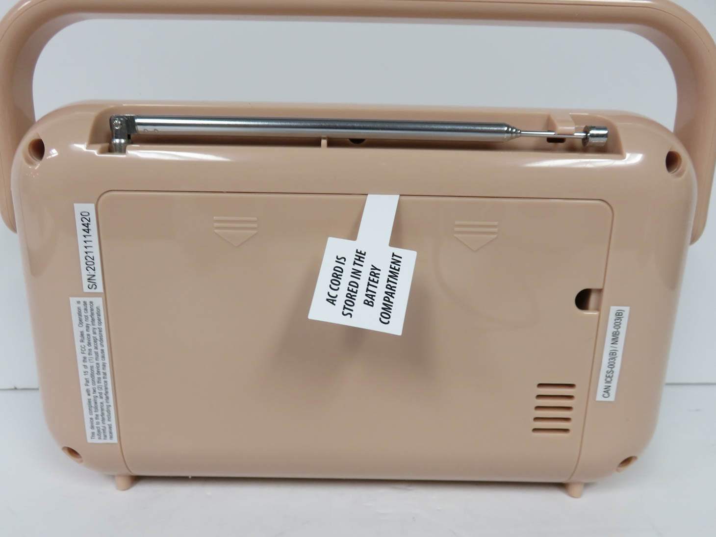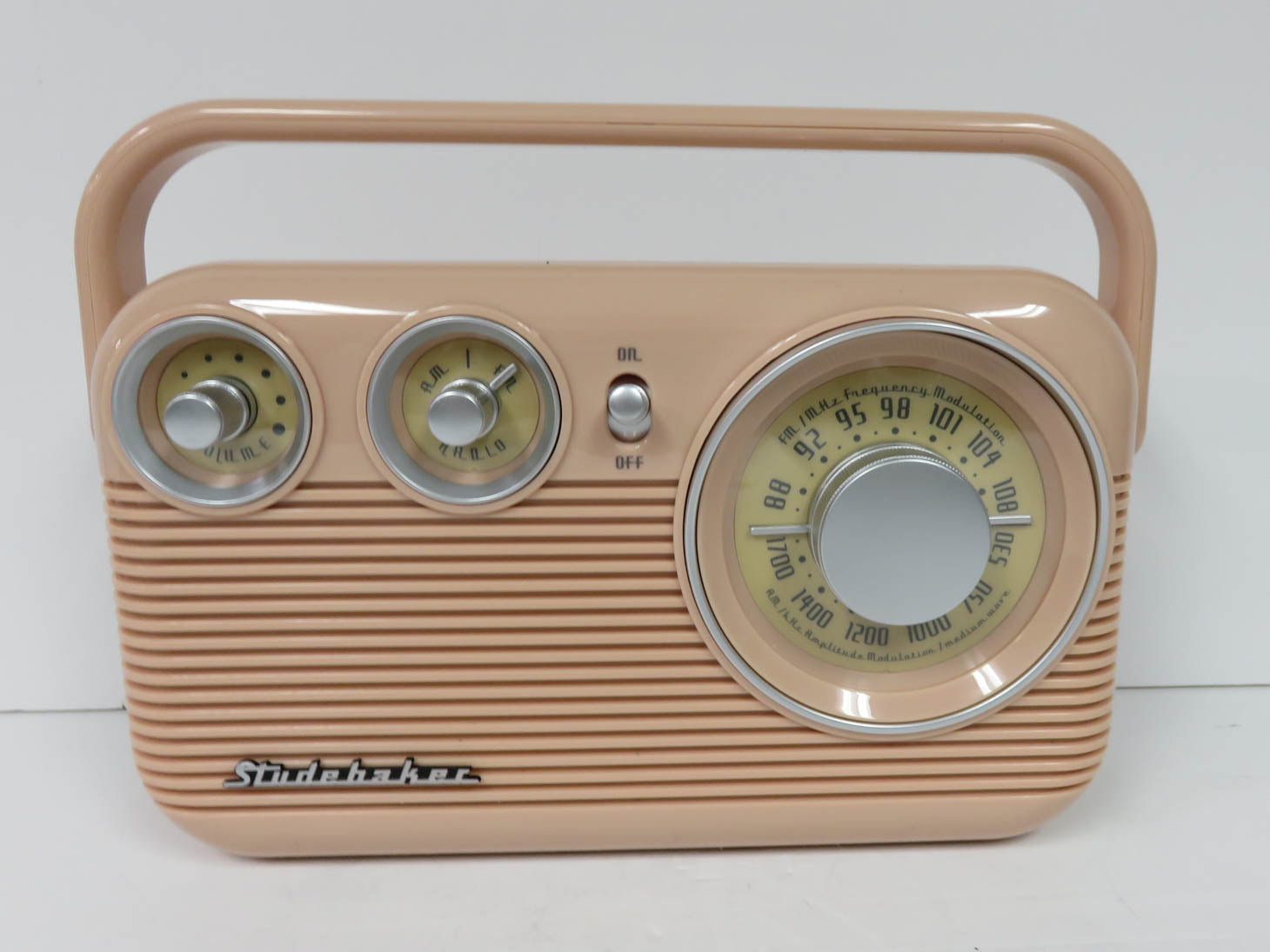 Retro design, pink with handle, new in box. Not tested.