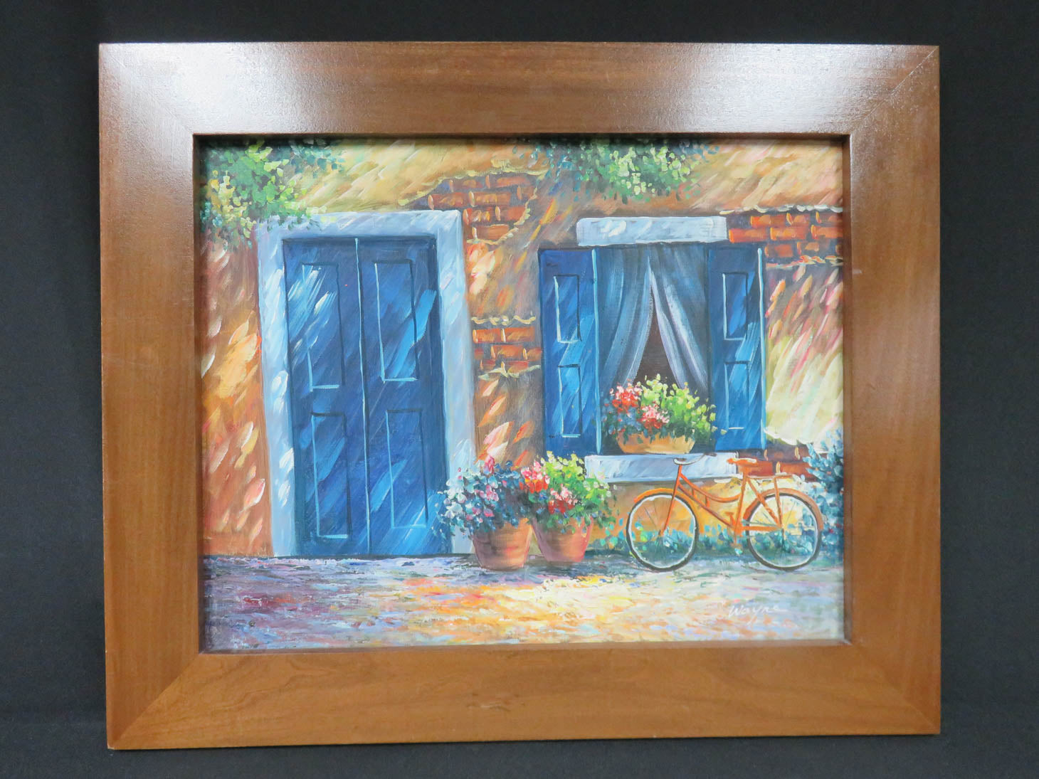 Item Number: 24133-111 Courtyard with blue shutters, flowers and bike, thick wood frame 24.5" x 20.5"