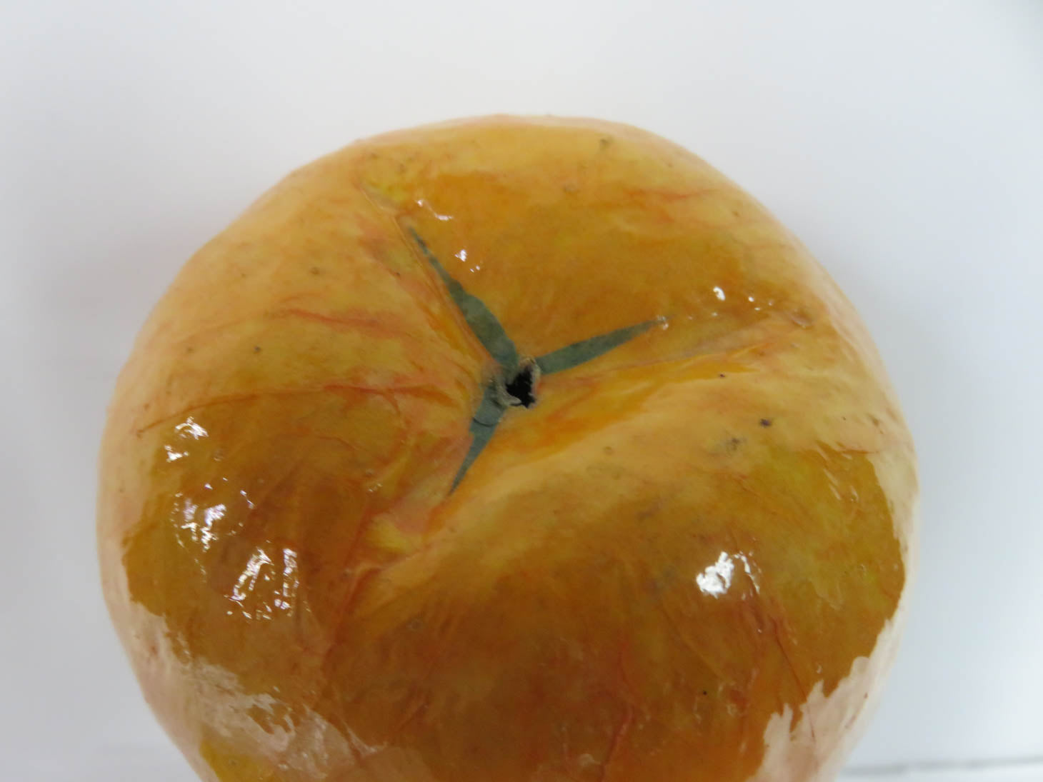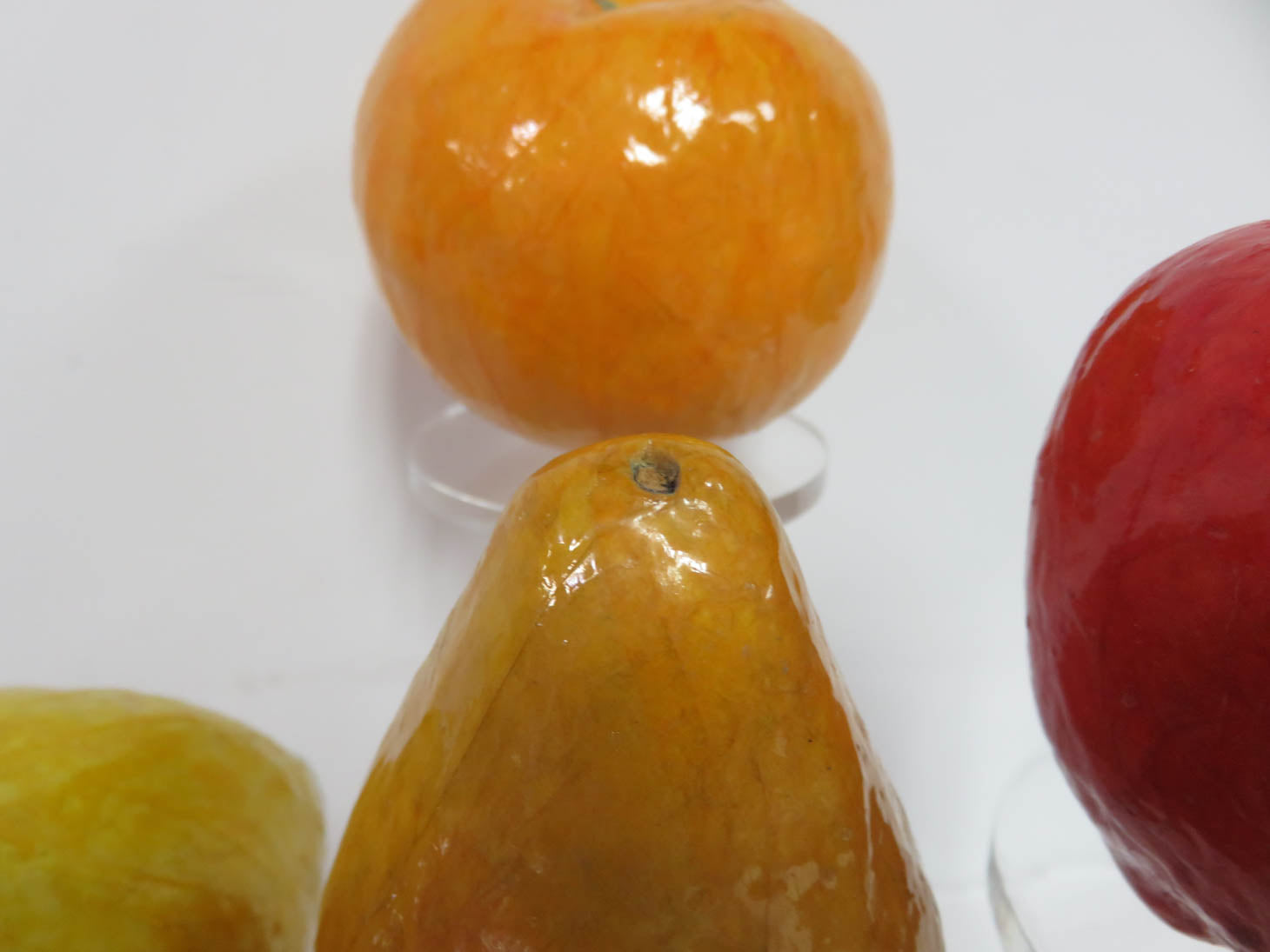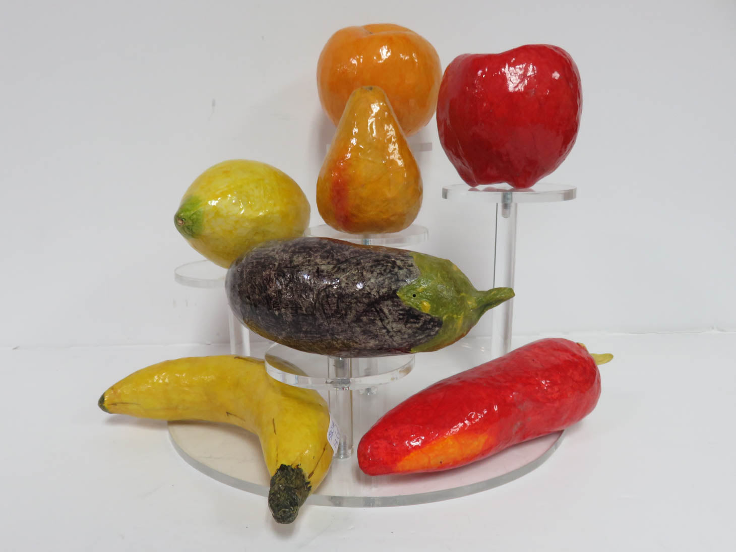 Item Number: 5807-18 Papier mache colorful, hand painted shaped designs. 7 pieces (orange and pear missing stem)