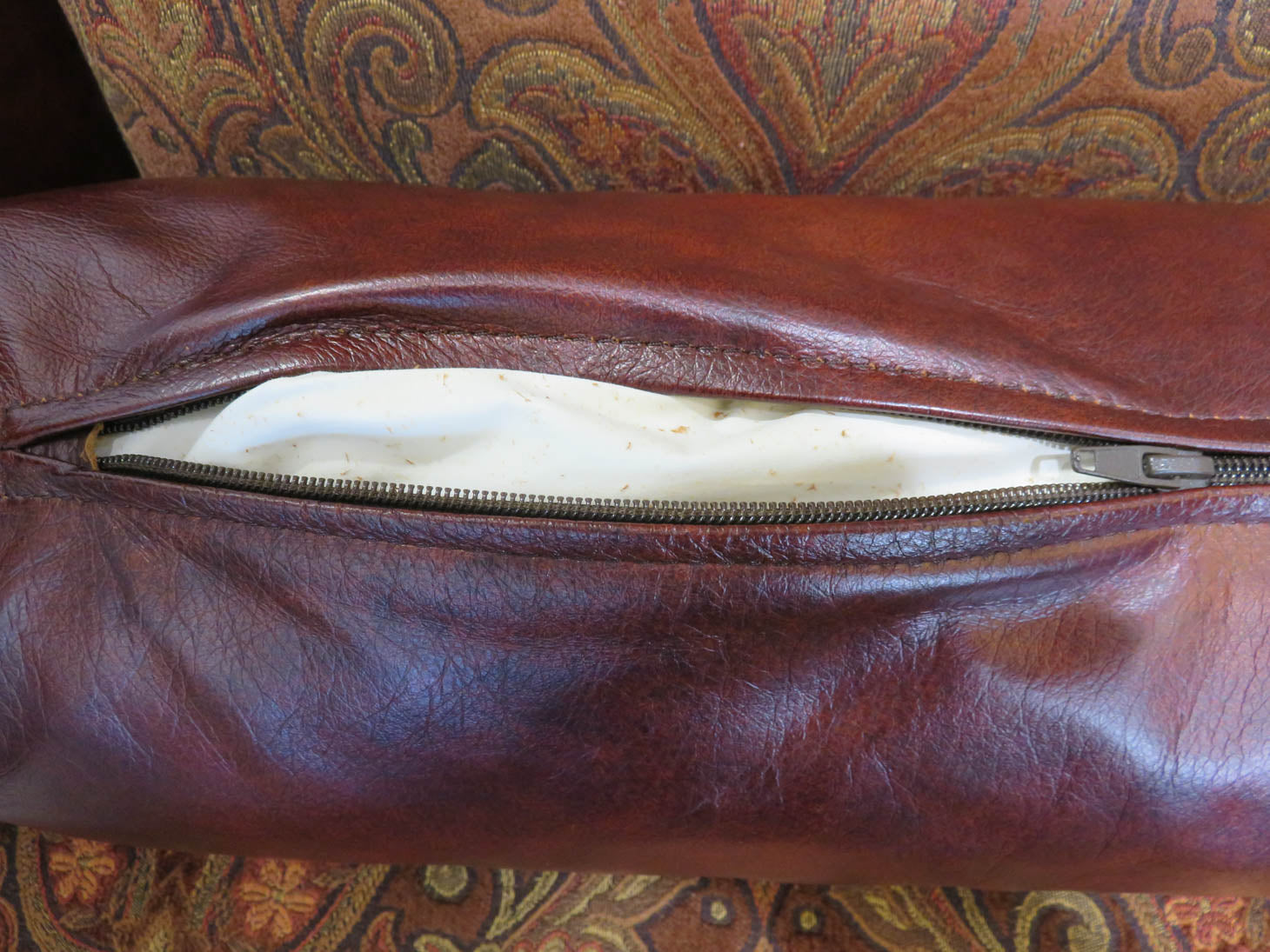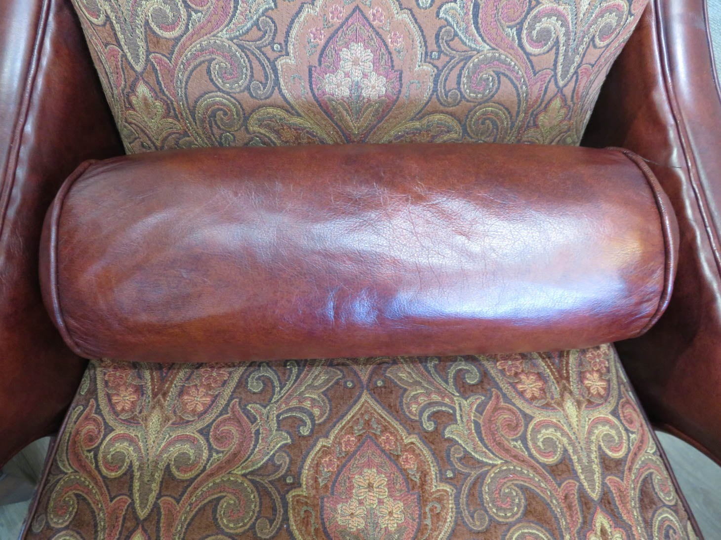 Item Number: 30036-3 Carved wood frame with leather arms and one lumbar pillow. two available, sold separately, #30036-2. 28" x 38" x 40.5"