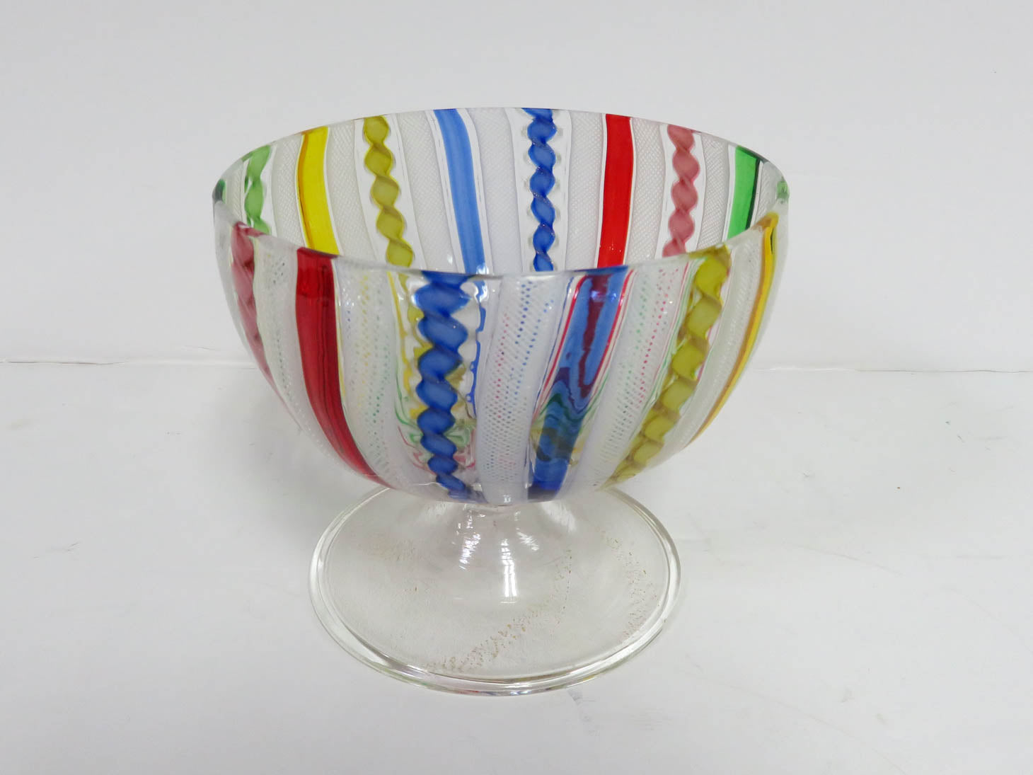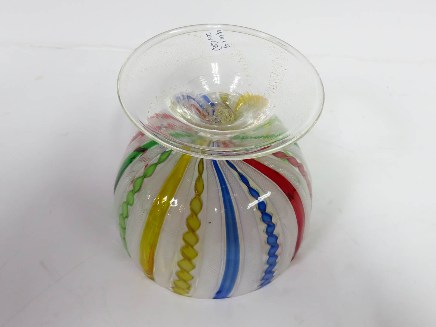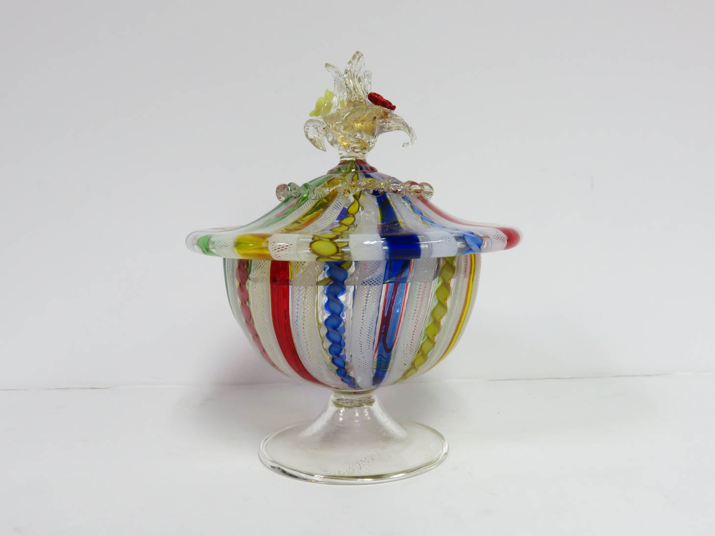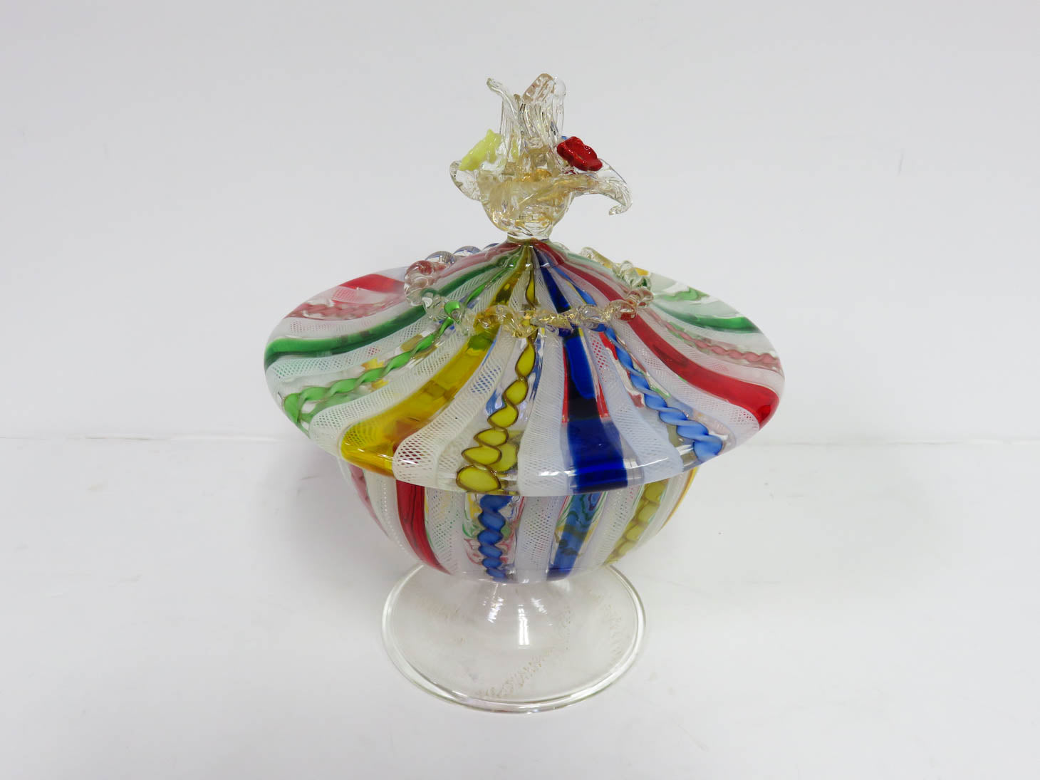 Murano-style, latticino lidded dish, round with colorful ribbon-like design on pedestal and leaf and floral topper, 2 pcs.
