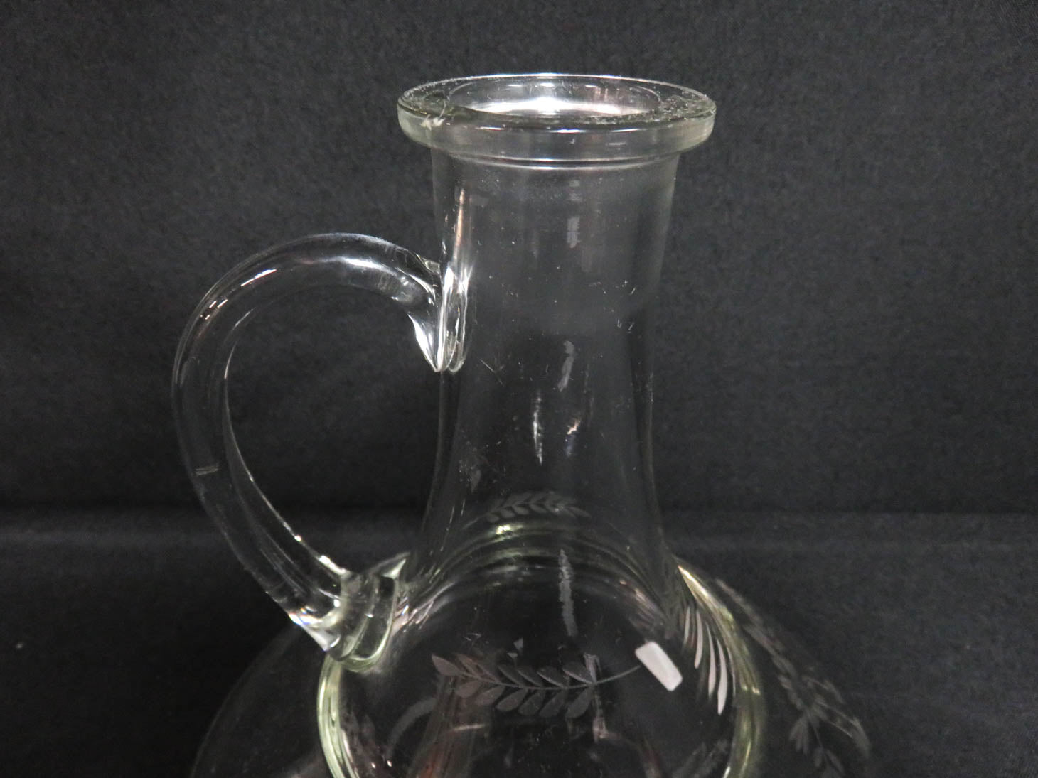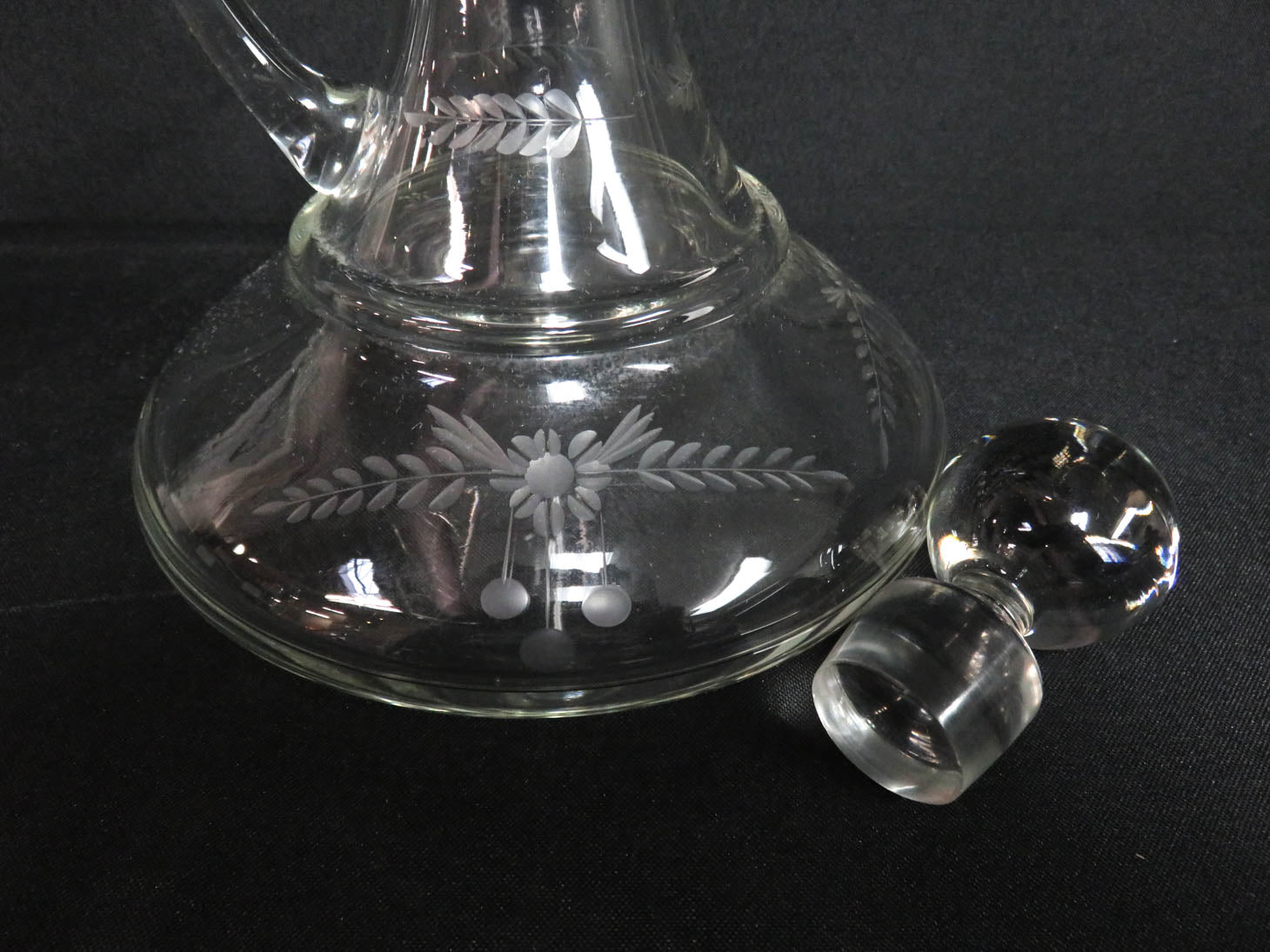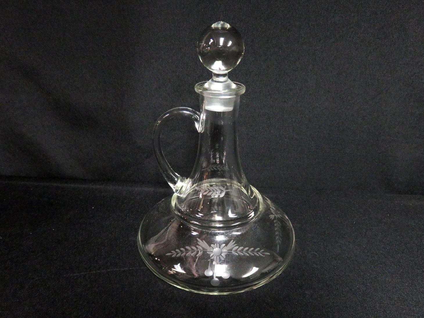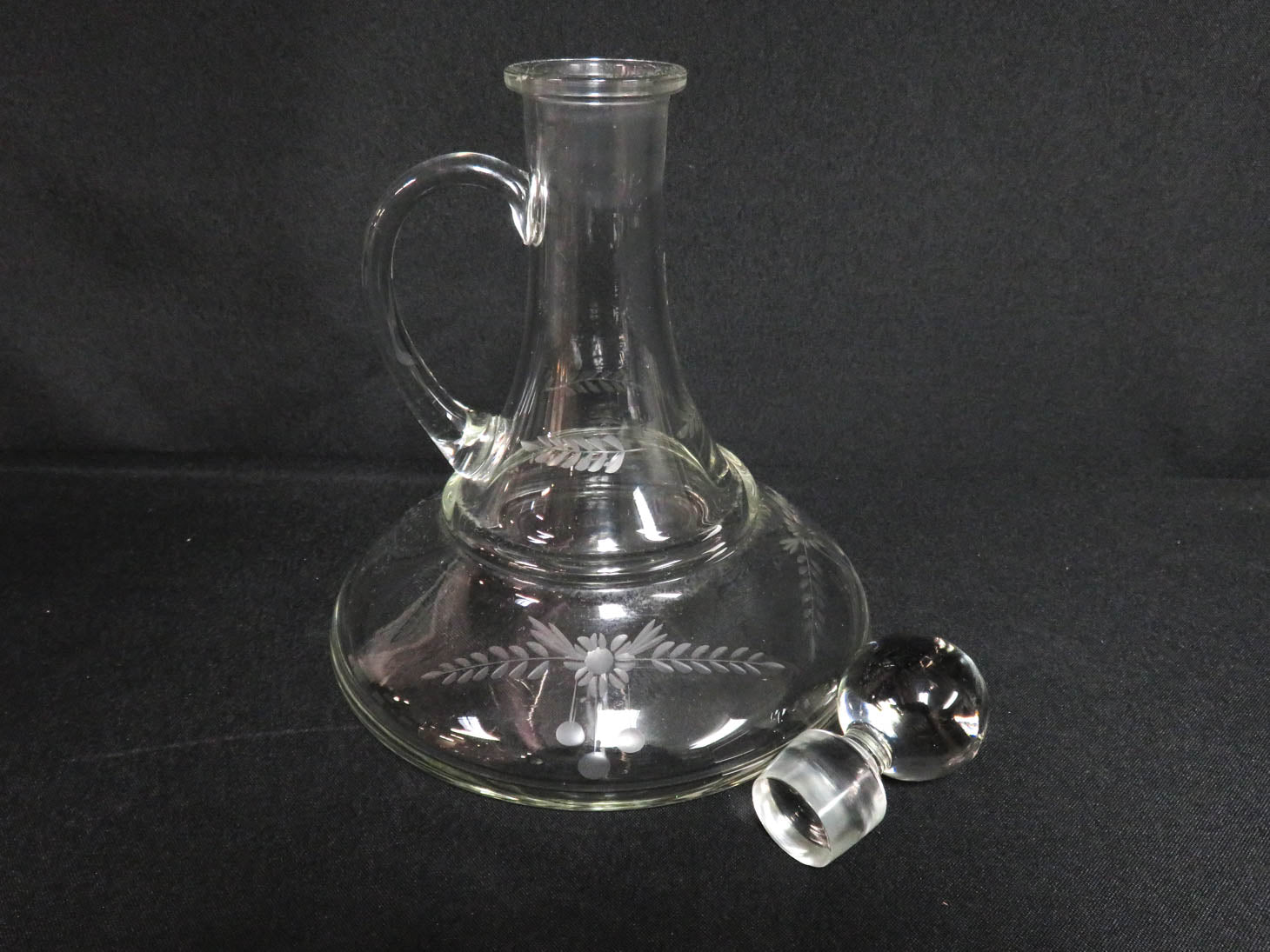 Clear, etched flowers and leaves, applied handle, stopper, 2 pc