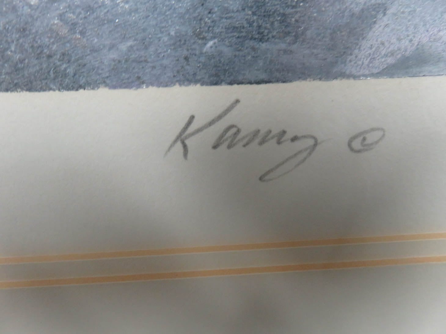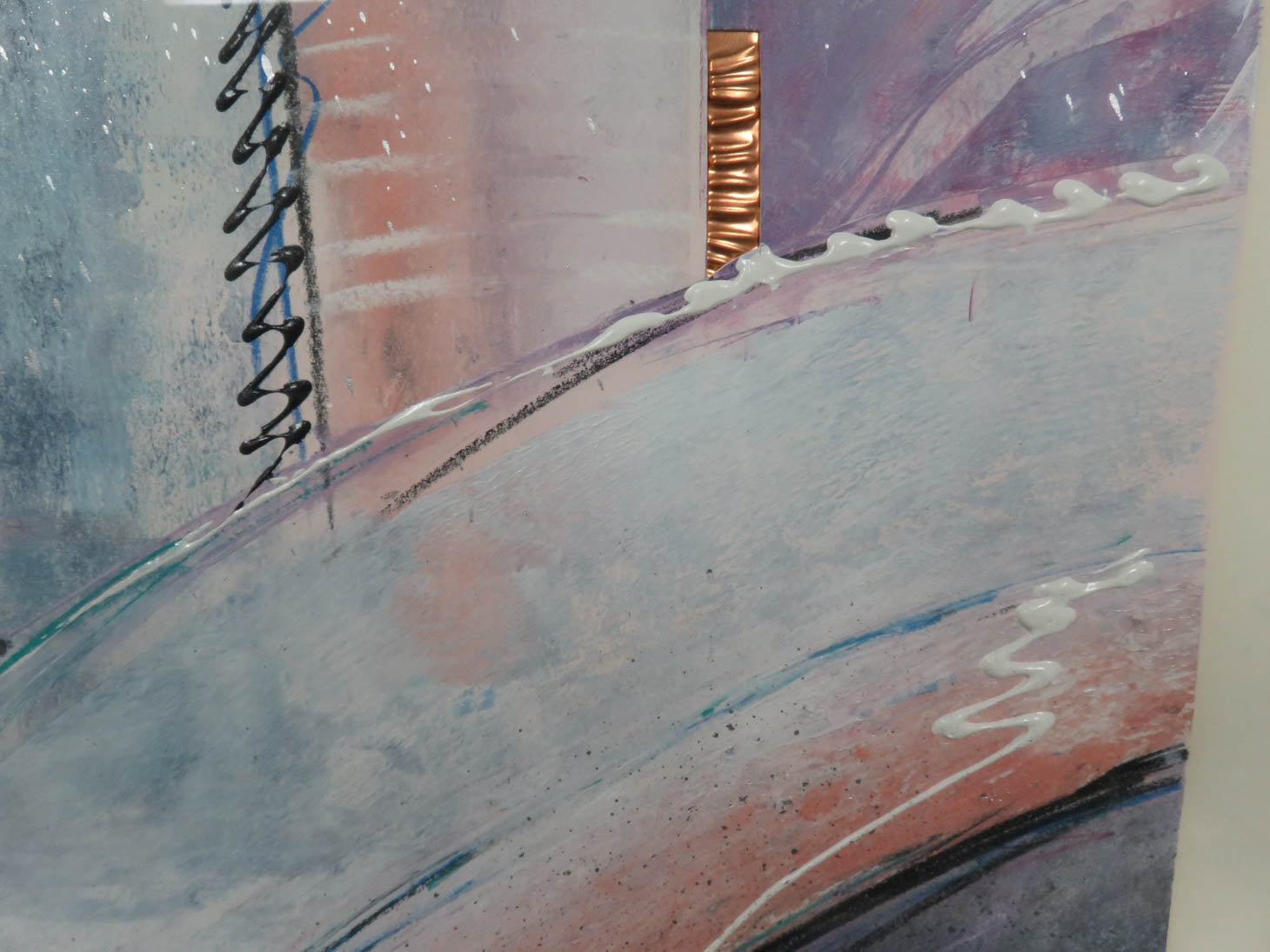 Limited Edition 1/1 by Kamy. Pastel abstract with paper, metal and painted accents in silver metal frame.