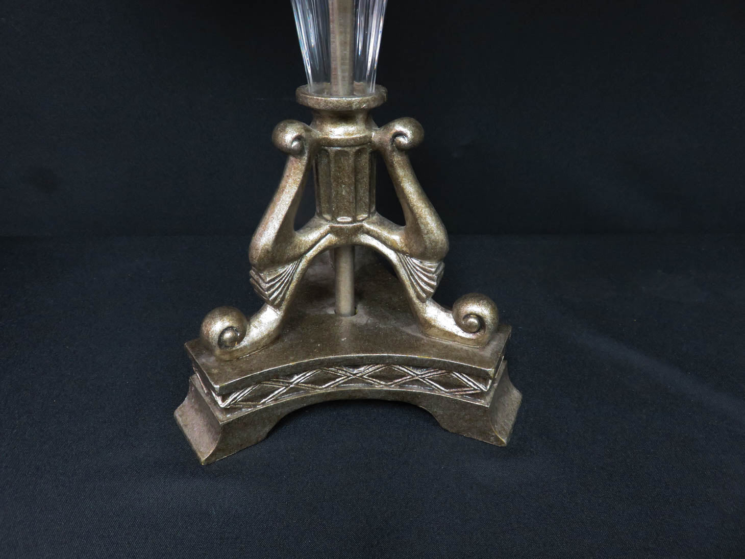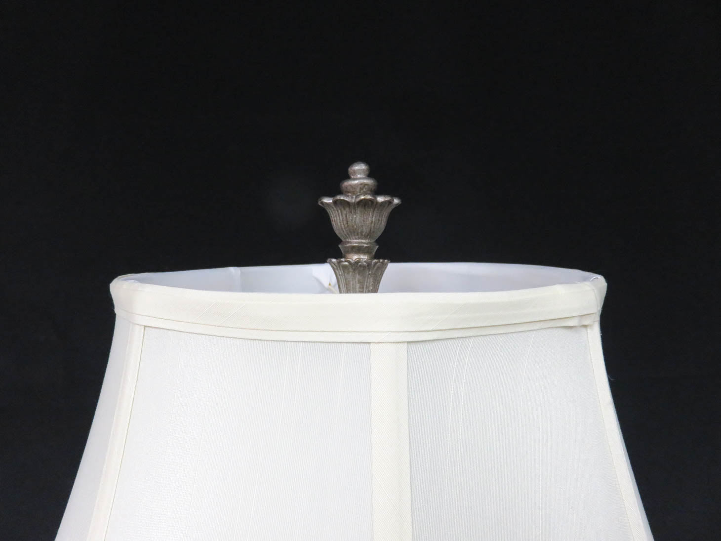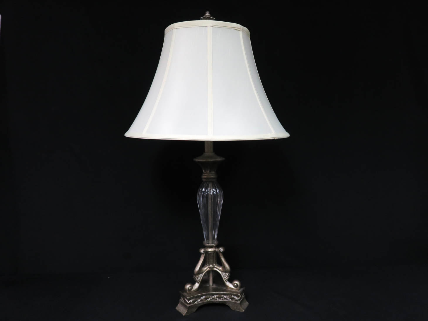 Item Number: 27641-145 Vintage design, glass orb on column, tripod base, ornate finial with a silk shade. 32.5" H