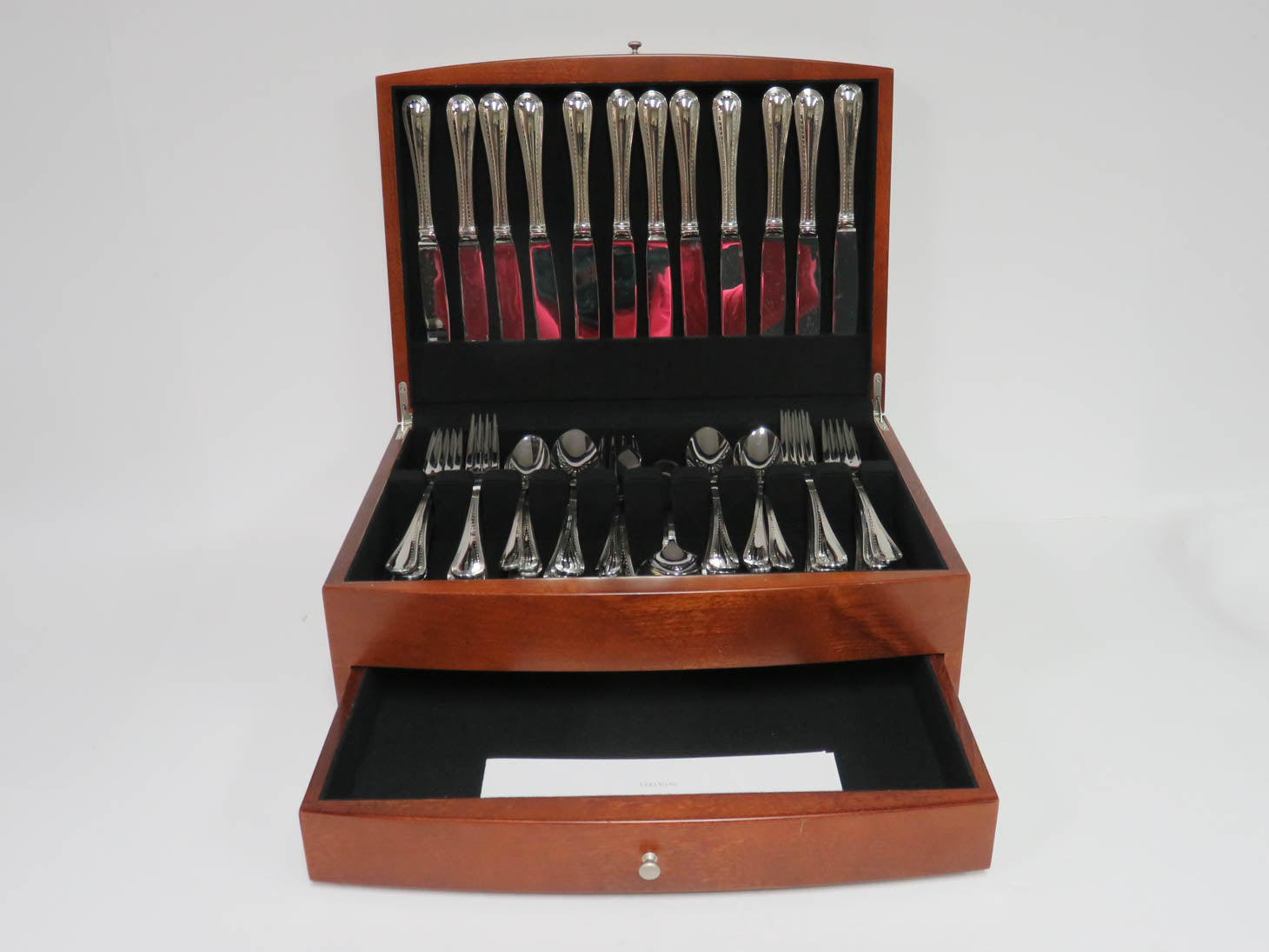 Item Number: 29730-2 5-piece service for 12, with 4 serving pieces in a wood storage box with drawer. For Wedgwood. 64 pieces and storage box