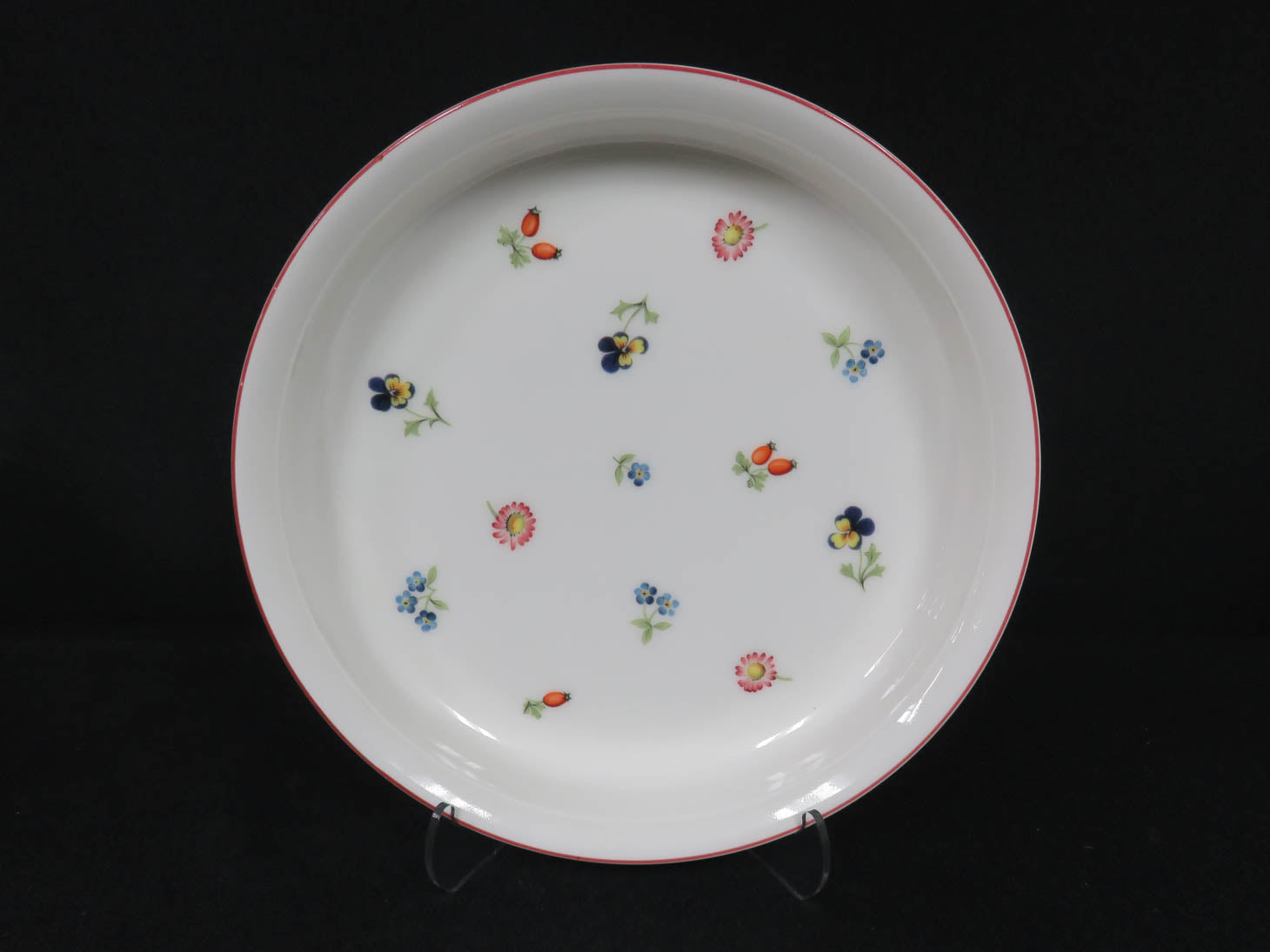 "Petite Fleur" round white with tiny floral design and red rim