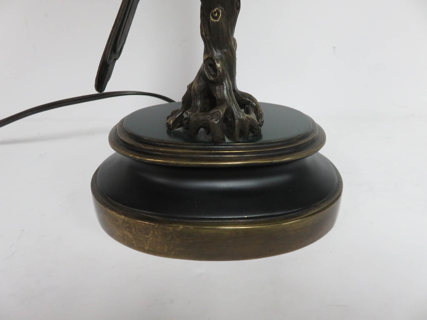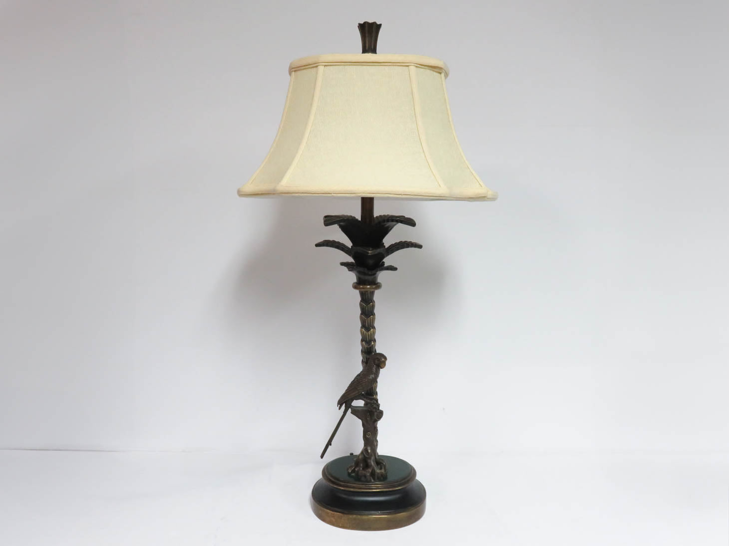 Parrot on perch with palm tree, oval base, ivory fabric shade. Dual lights on toggle switch.