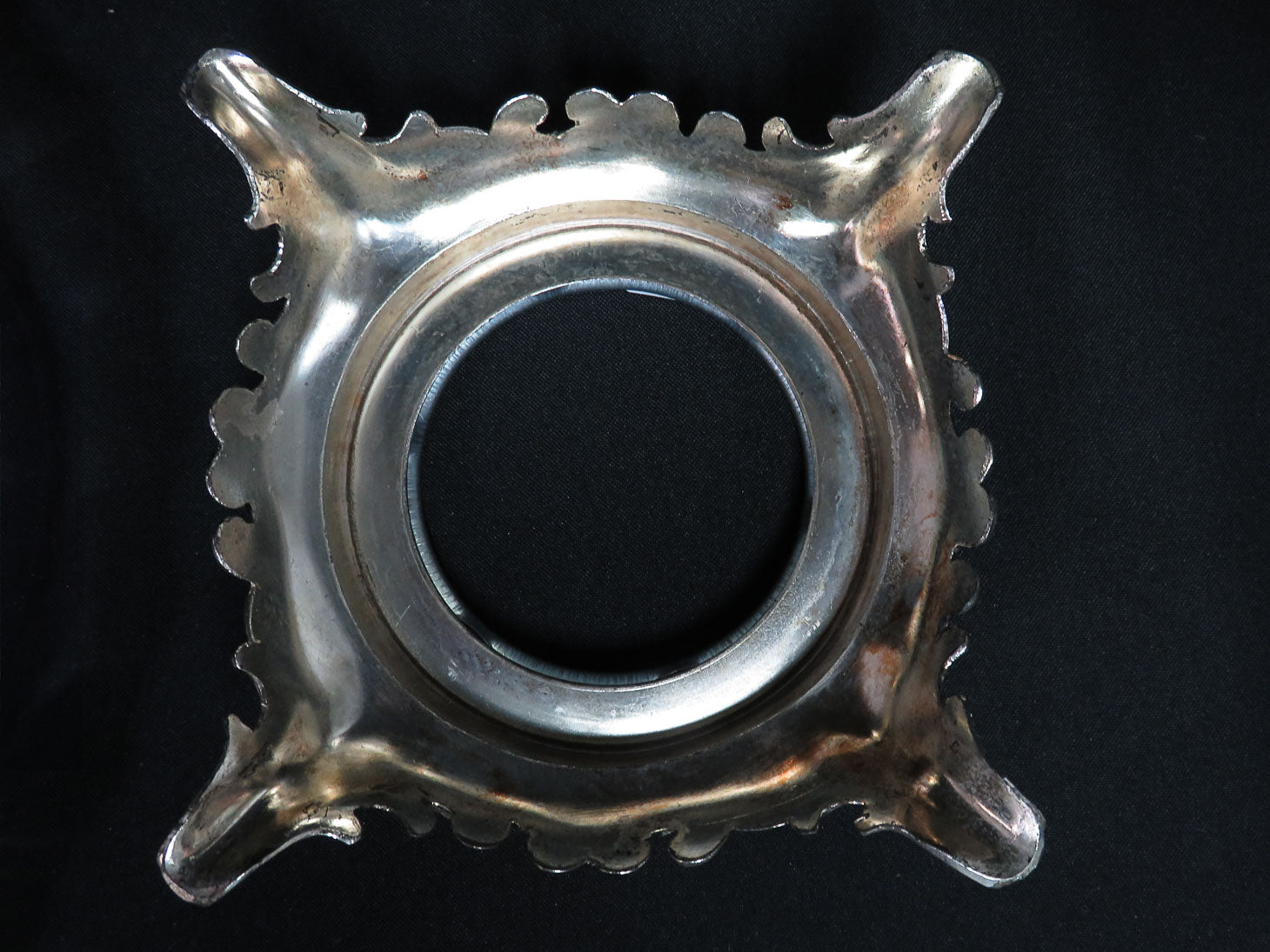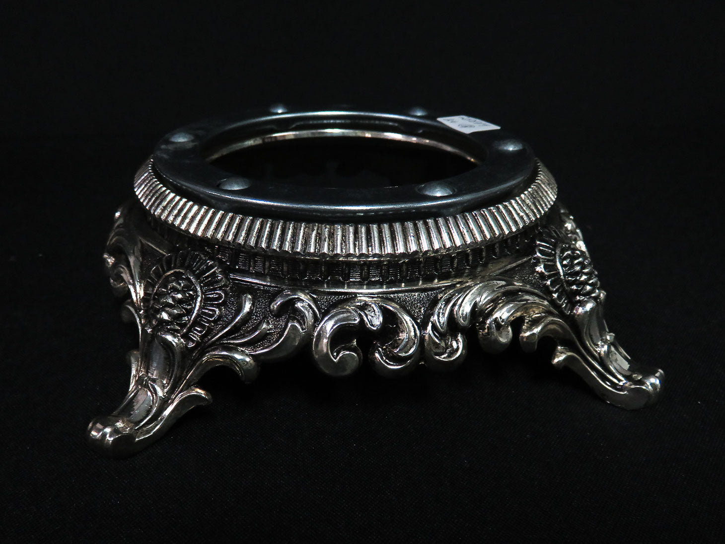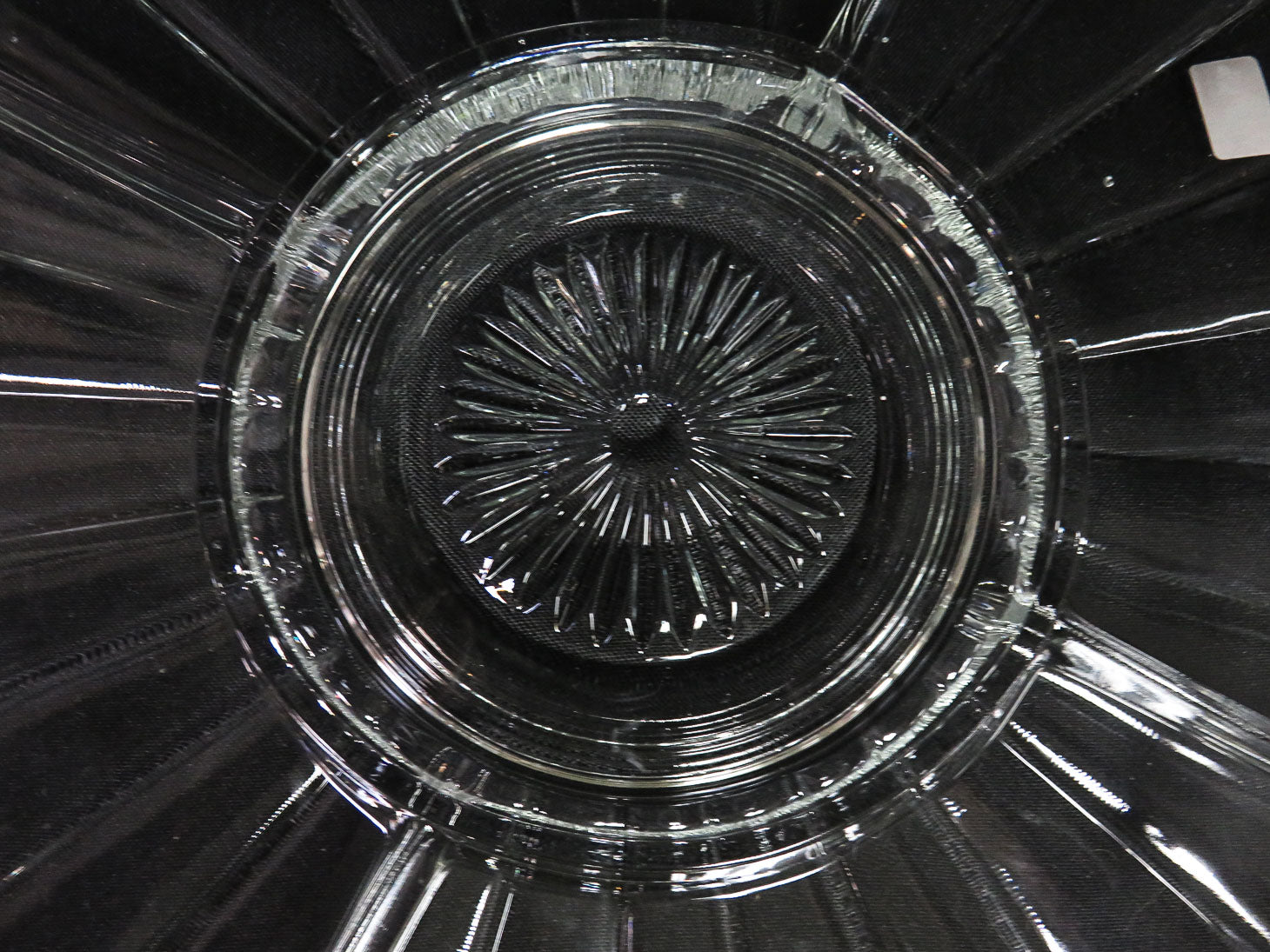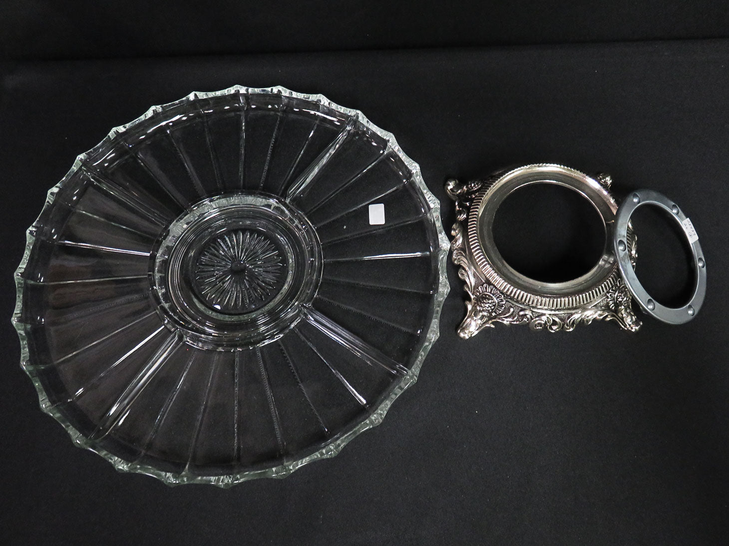 Clear 5 sections, scalloped edge, footed scrolled silver base with castor rotating band, 3 pc