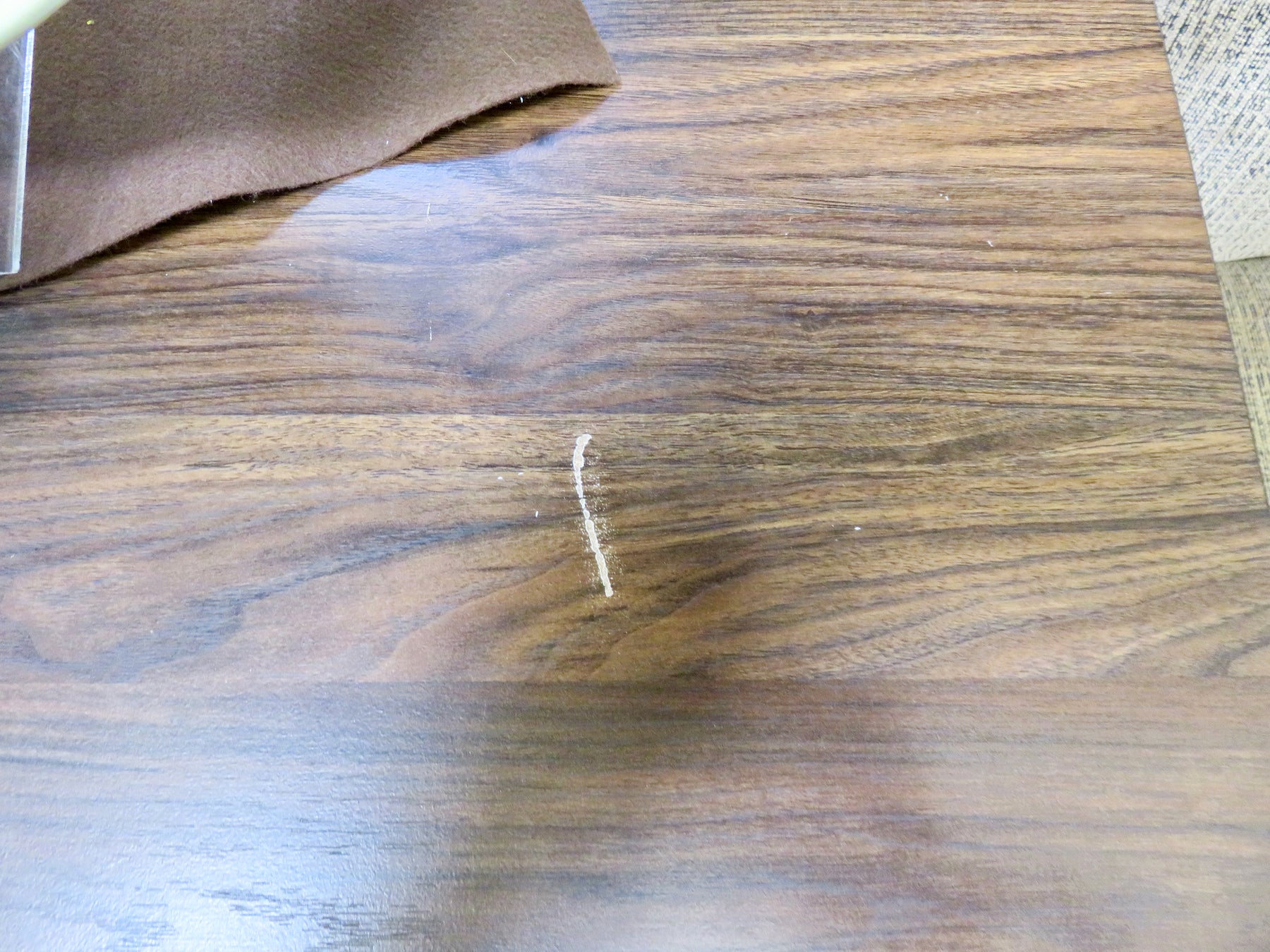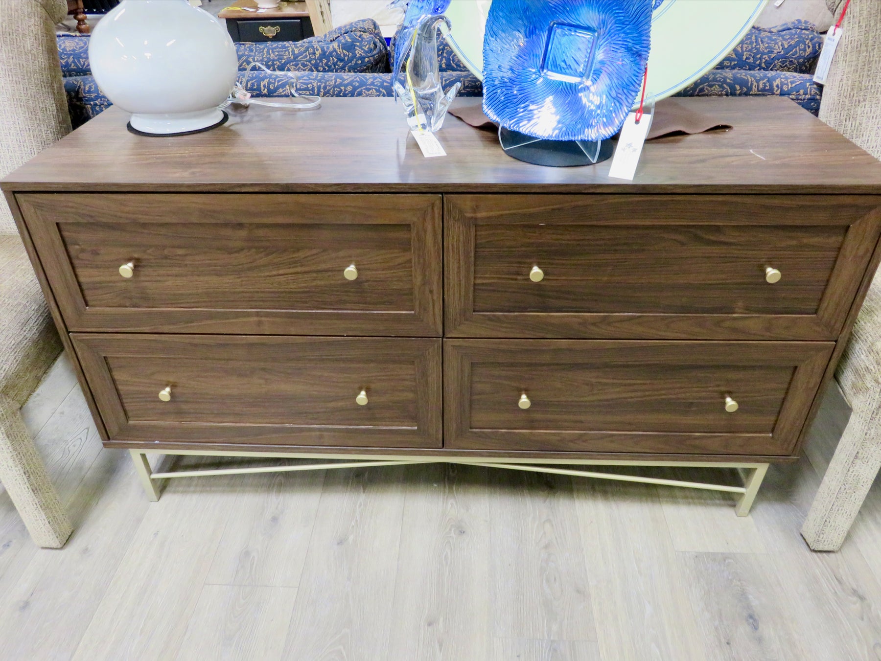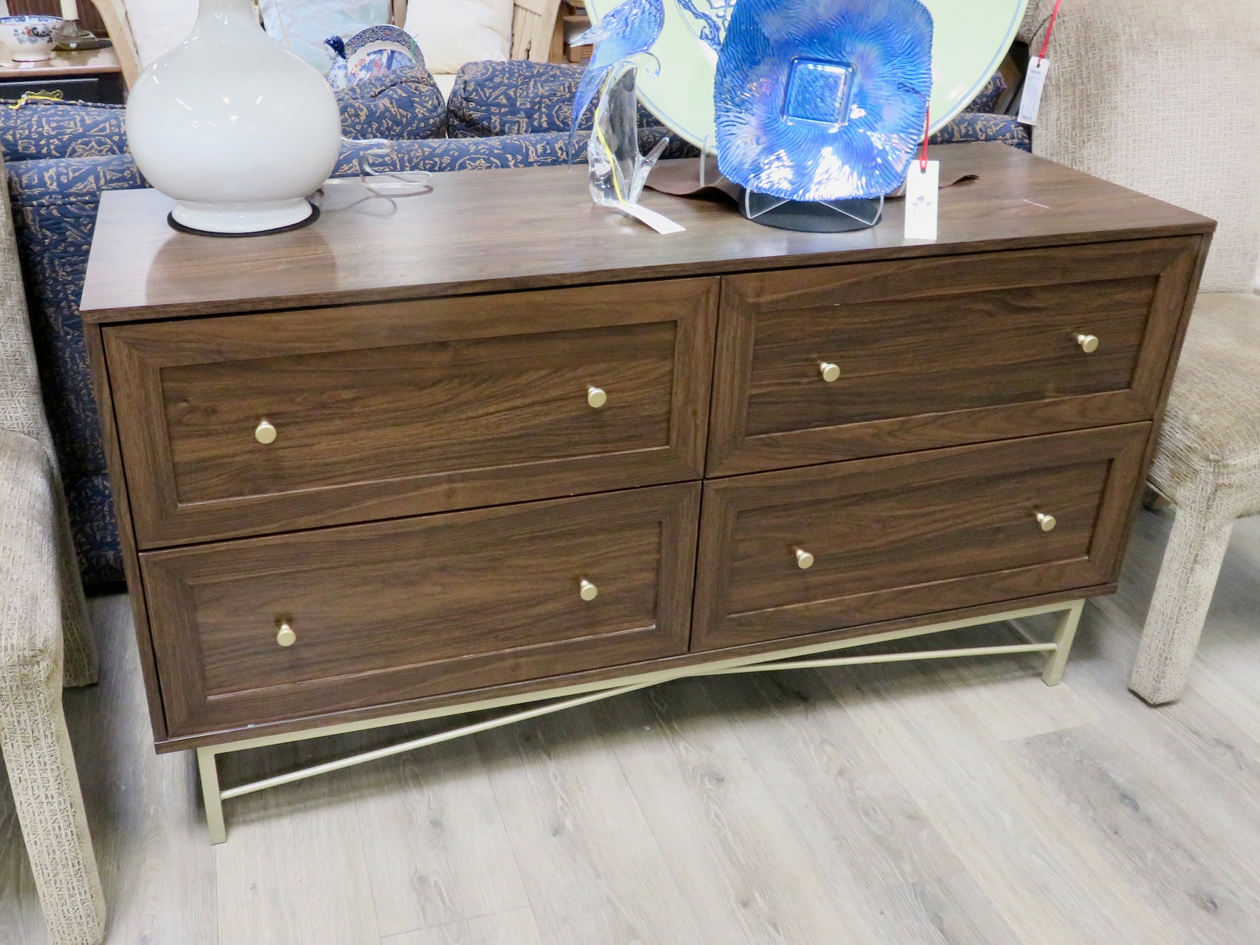 Four drawers with round gold knobs. Gold tone metal legs and stretcher. Scratch on top surface.