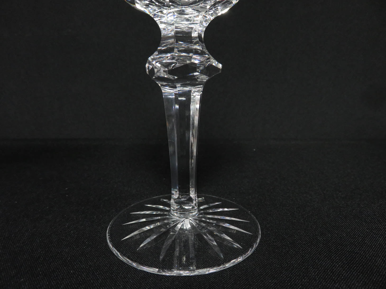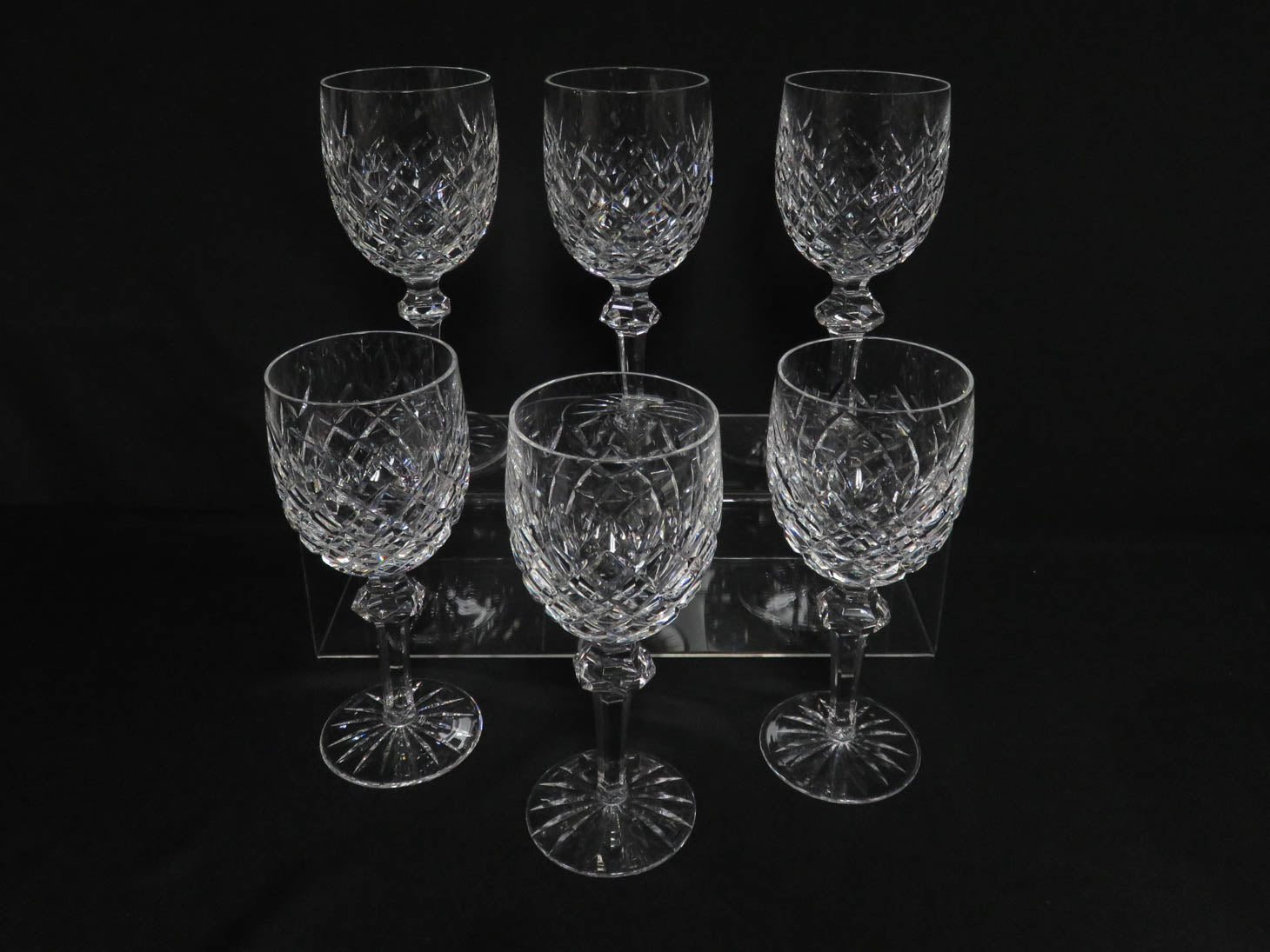 Set of 6 "Powerscourt" diamond pattern, faceted stem and knop, starburst base.